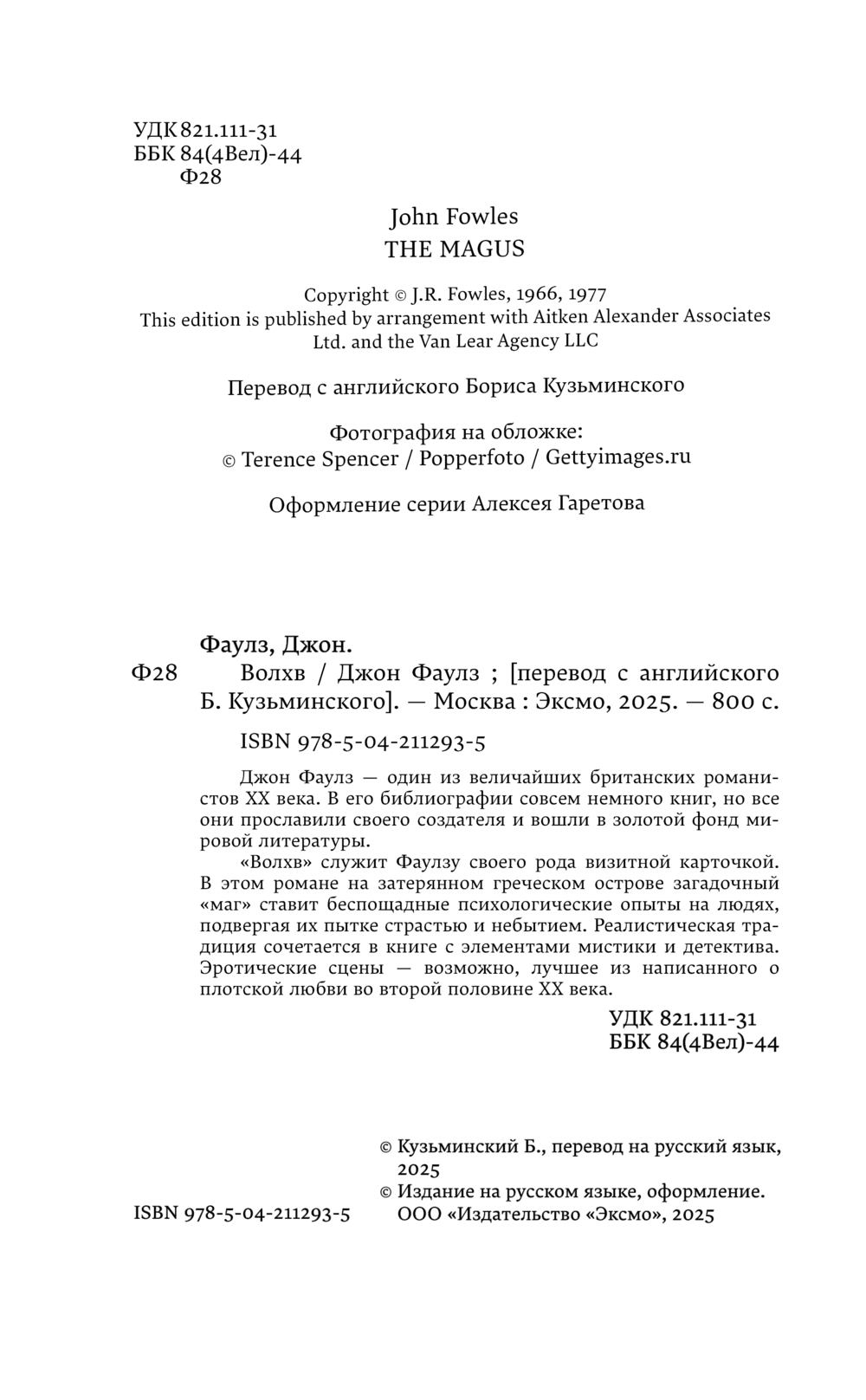 "Волхв" служит Фаулзу своего рода визитной карточкой. В этом романе на затерянном греческом острове загадочный "маг" ставит беспощадные психологические опыты на людях, подвергая их пытке страстью и небытием. Реалистическая традиция сочетается в книге с элементами мистики и детектива. Эротические сцены – возможно, лучшее из написанного о плотской любви во второй половине ХХ века.
