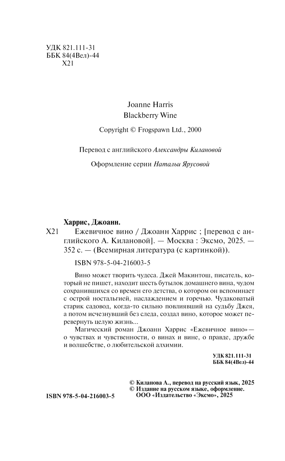 Магический роман Джоанн Харрис "Ежевичное вино" – о чувствах и чувственности, о винах и вине, о правде, дружбе и волшебстве, о любительской алхимии.