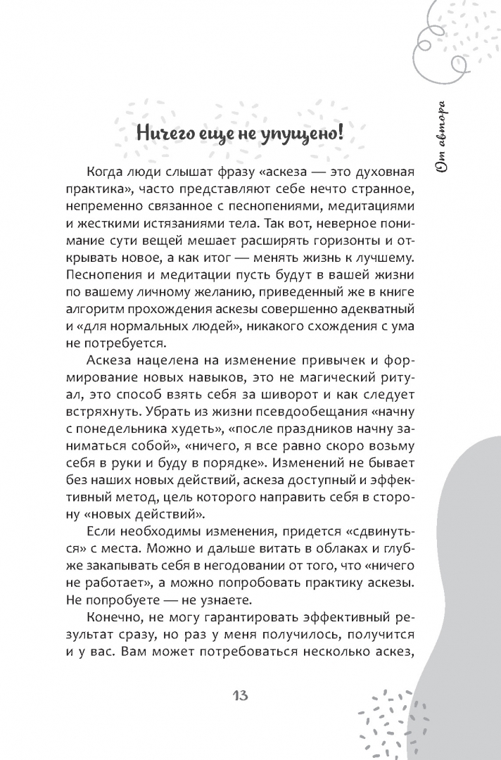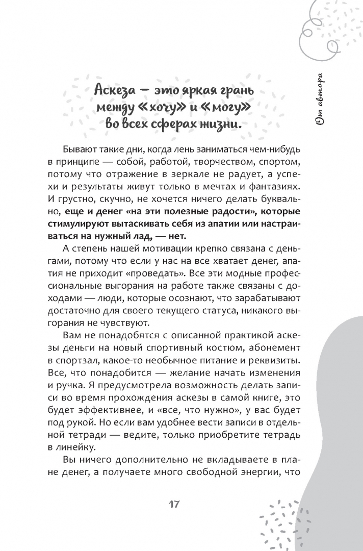 Вполне возможно, вы уже многое перепробовали, но чувствуете, что этого всего недостаточно для долгожданных изменений в вашем теле, уме и жизни в целом. Аскеза – это доступный способ ввести нужные привычки в практику, прийти к внутреннему балансу и сконцентрироваться на истинных целях и желаниях, отказавшись от негативных установок, которые провоцируют рост лени и апатии.