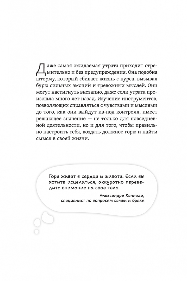 Чтобы вы могли прожить и отпустить боль, в этом издании собраны наиболее эффективные психологические инструменты из лучших книг, посвященных утратам. Выполнение упражнений позволит пережить потерю, приведет к ясности восприятия окружающего мира и эмоциональному покою. Все техники были тщательно изучены и опробованы на сотнях людей, которые обращались за помощью в связи со своим горем и трауром. Поэтому вы можете быть уверены, что хотя бы одна из предложенных в книге практик подойдет именно вам.