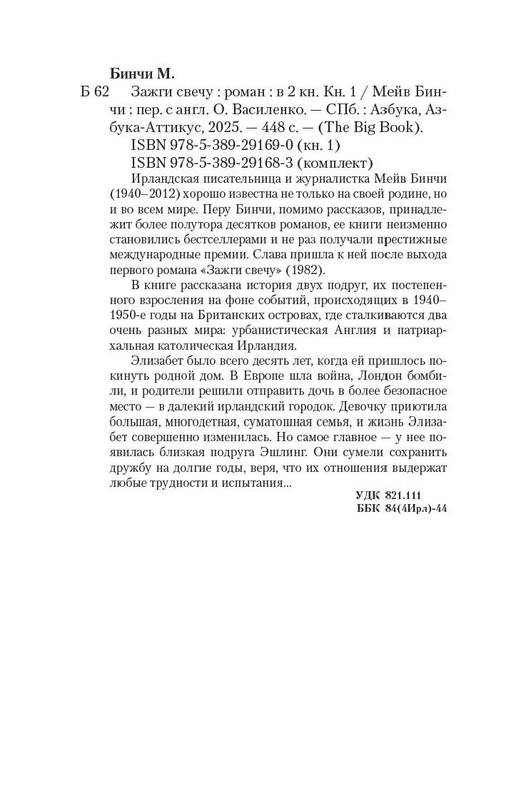 Ирландская писательница и журналистка Мейв Бинчи (1940–2012) хорошо известна не только на своей родине, но и во всем мире. Перу Бинчи, помимо рассказов, принадлежит более полутора десятков романов, ее книги неизменно становились бестселлерами и не раз получали престижные международные премии. Слава пришла к ней после выхода первого романа "Зажги свечу" (1982).
