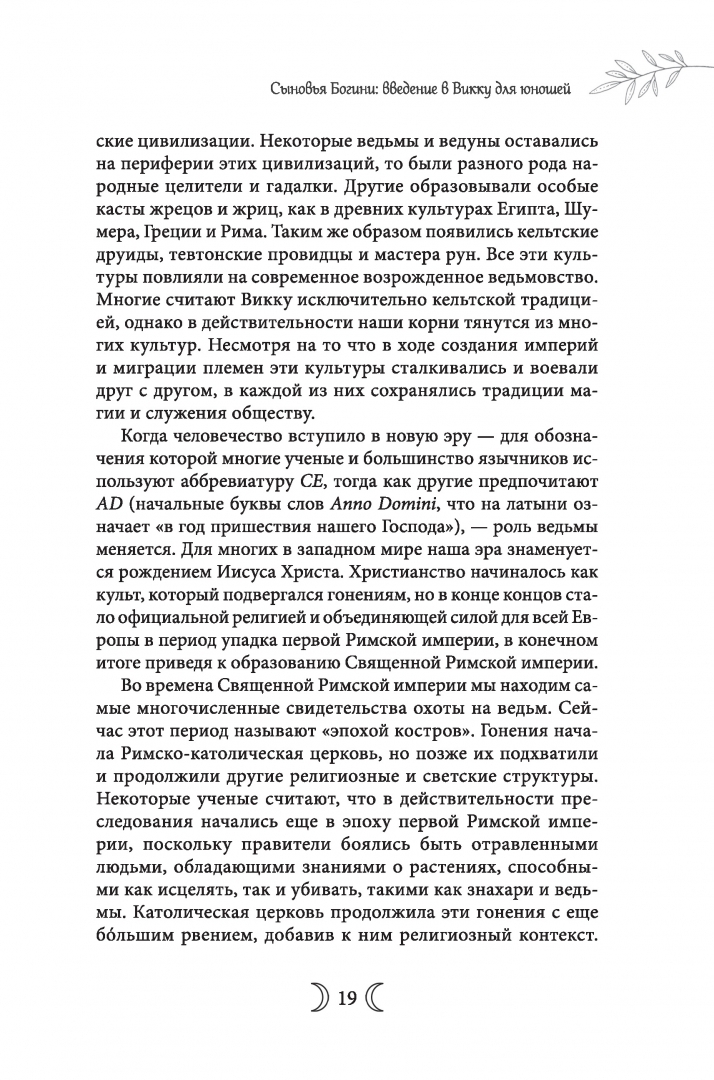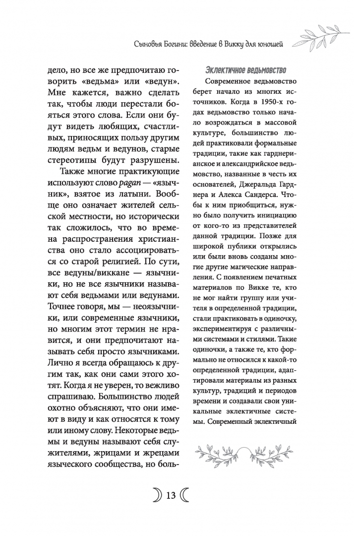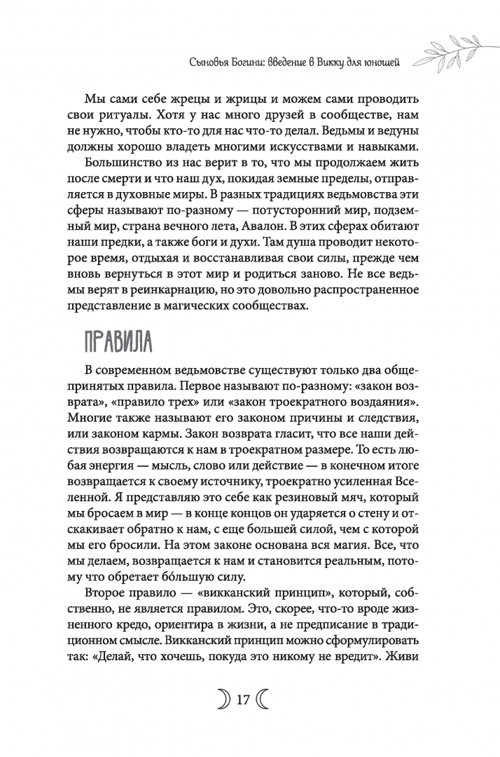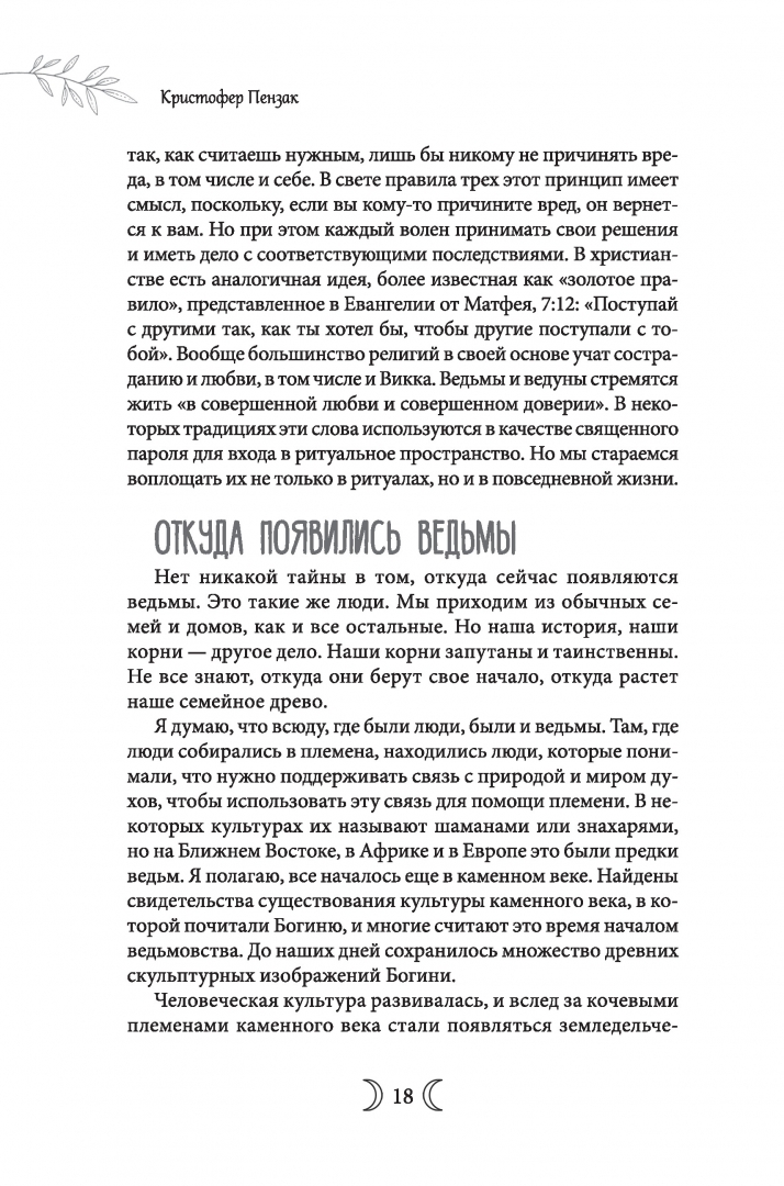 В яркой и занимательной форме эта книга раскрывает множество тем – основы проведения ритуалов, значение мифологических историй и арканов Таро, управление эмоциями, сексуальность, принципы практической магии, составление заклинаний и празднование саббатов. Автор показывает, что колдовство и ритуалы – не способ сбежать из реального мира в страну фантазий, а ценные инструменты, которые помогают лучше осознать свое место во вселенной и жить более насыщенной и полной жизнью.