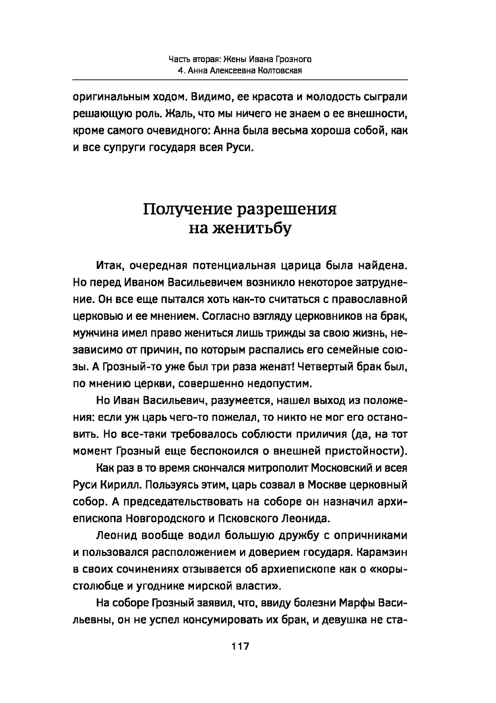 Иван Грозный вошел в историю как царь-тиран, а его жены – как безгласные тени, исчезающие в летописях одной строкой. Они становились жертвами его подозрительности и жестокости. Эта книга – попытка разглядеть за строками древних текстов живых женщин: юных, напуганных, обреченных. Их краткие жизни – трагические эпизоды, отражение эпохи, где даже царская невеста была лишь разменной монетой в династических играх. И тем не менее, брак с каждой из них повлиял и на личность царя, и на историю государства.