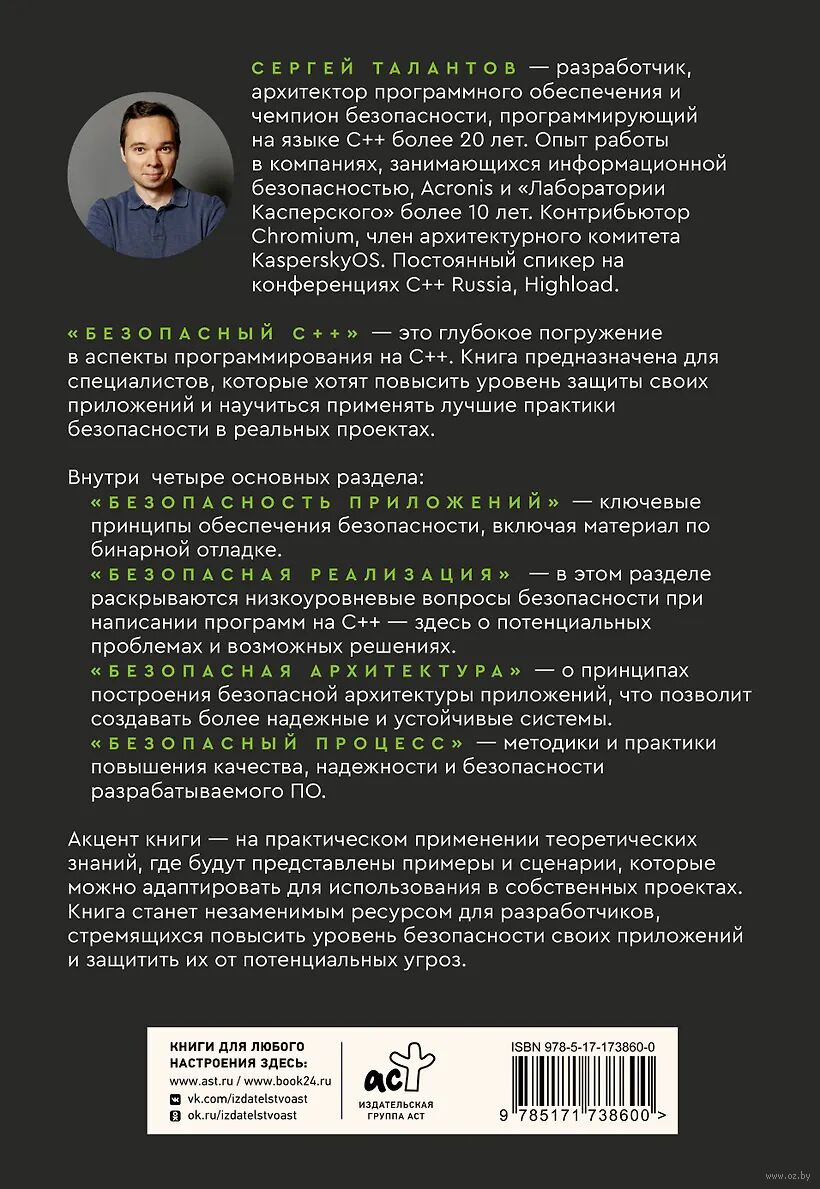 "Безопасный С++" – это глубокое погружение в аспекты программирования на C++. Книга предназначена для специалистов, которые хотят повысить уровень защиты своих приложений и научиться применять лучшие практики безопасности в реальных проектах.