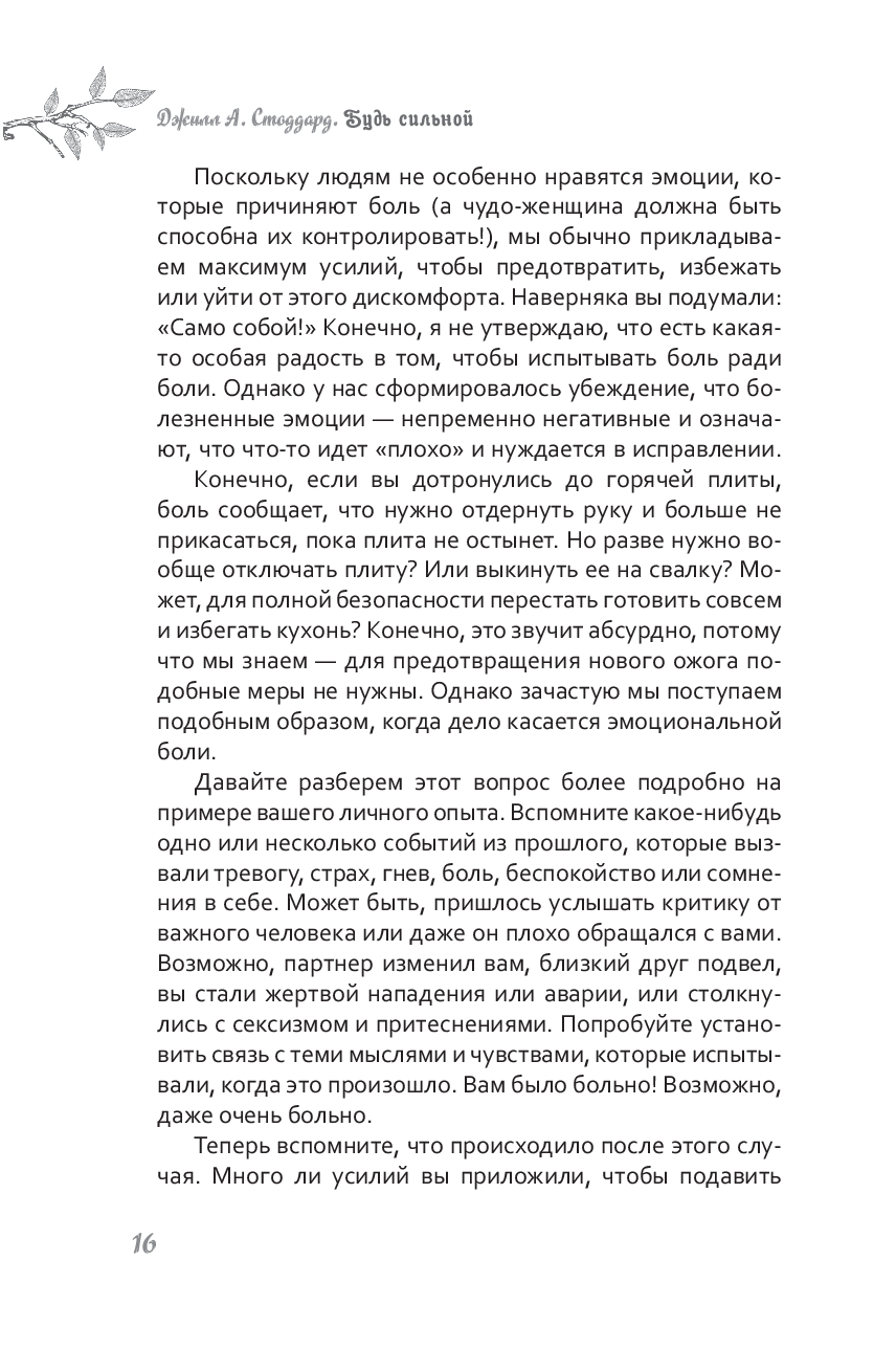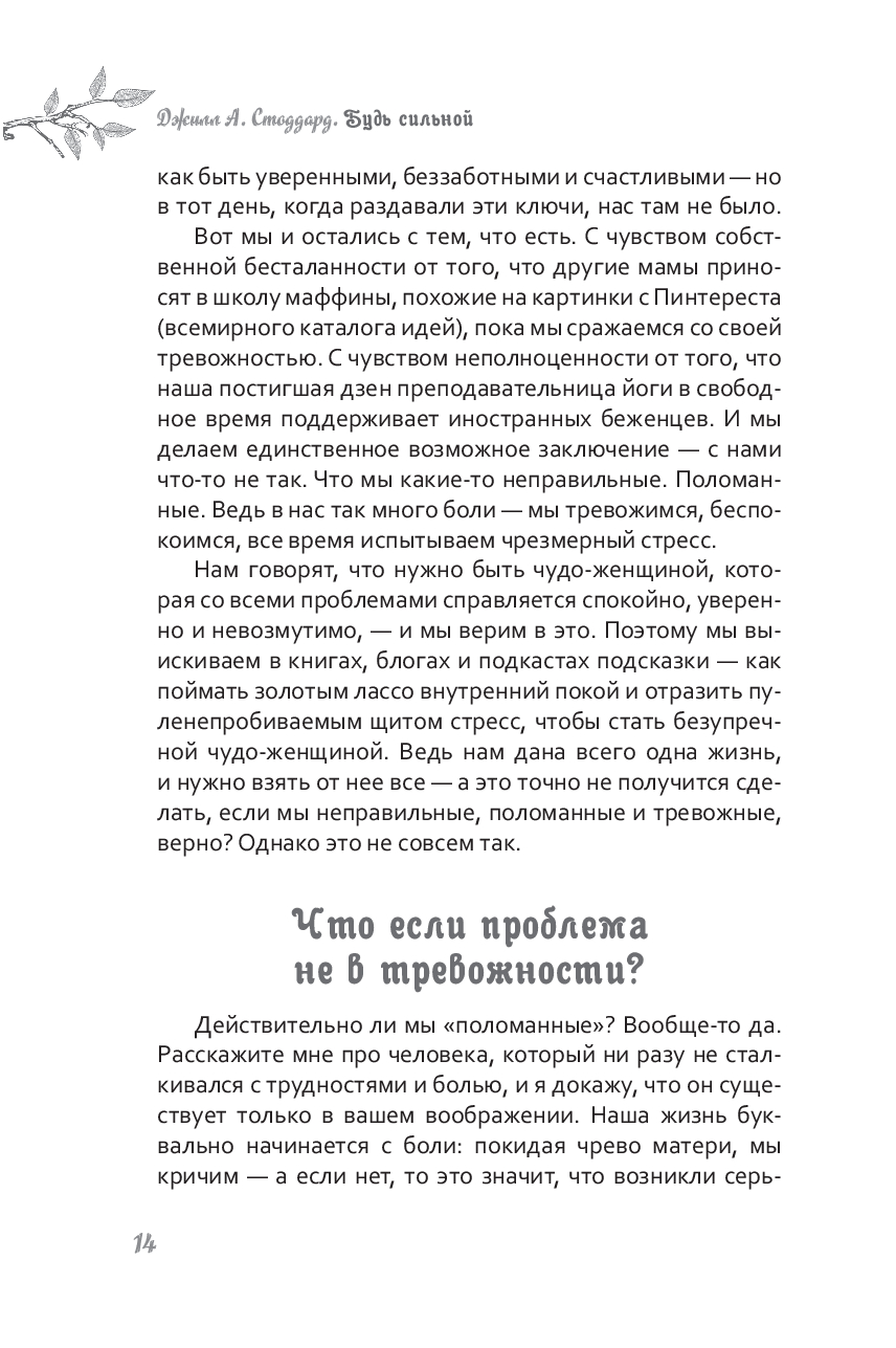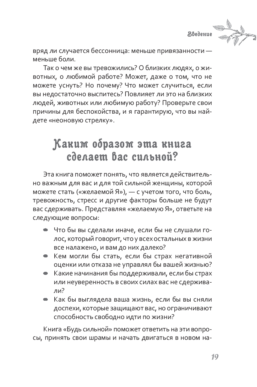Быть сильной – это не значит во всем быть совершенной и ничего не бояться. Это значит жить полной и осмысленной жизнью, несмотря на боль, ошибки и стресс, которые ее сопровождают. Пытаясь избежать неприятных чувств, мы делаем себя заложниками нереалистичных идеалов. Когда вы сможете встретить тревогу и страхи лицом к лицу, они больше не будут мешать вам достигать своих целей и двигаться к той жизни, к которой вы стремитесь.