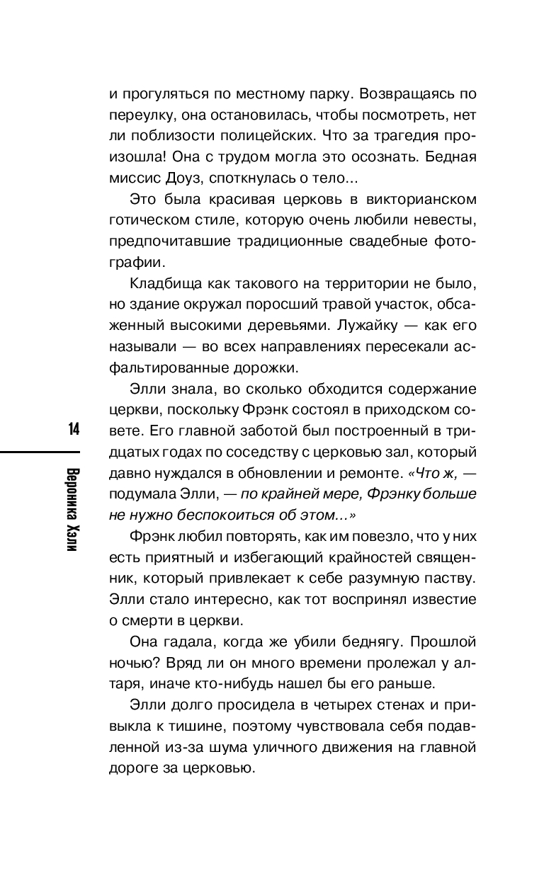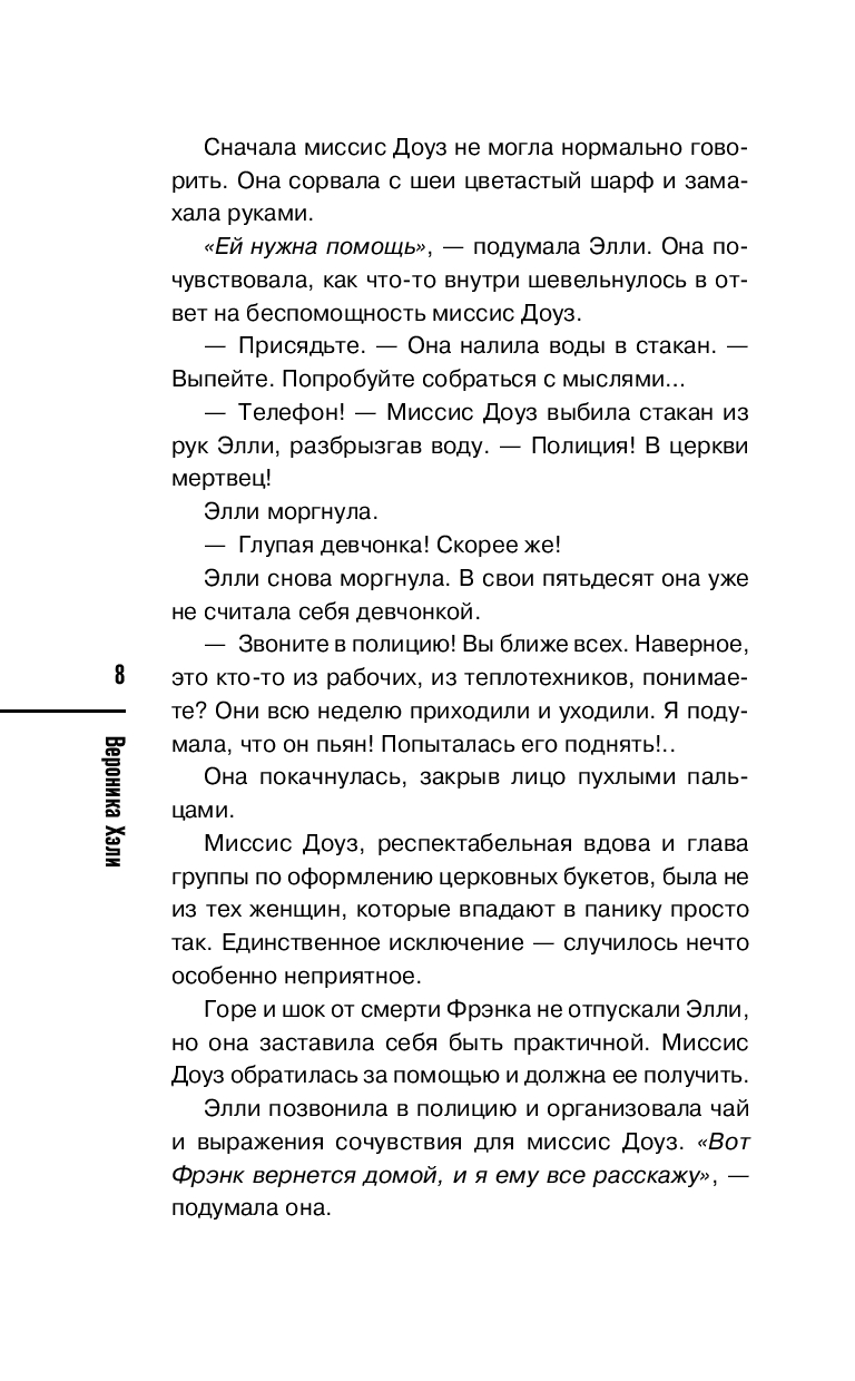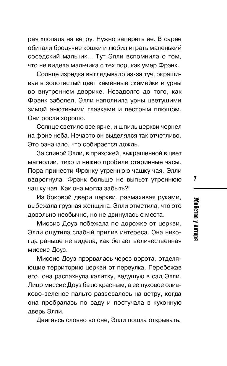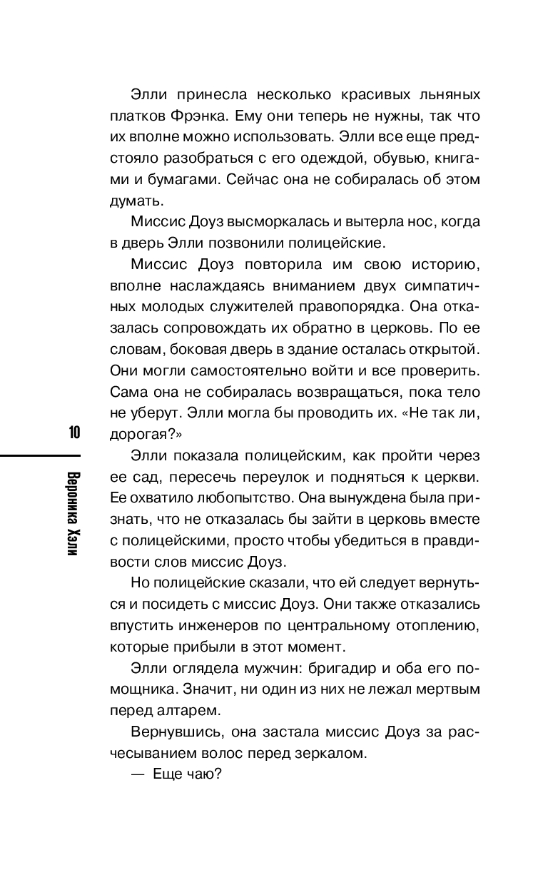 В одном из зеленых районов Лондона все знают милую старушку Элли Квик, работающую в благотворительном магазинчике. Недавно овдовев, она целыми днями смотрит в окно. Пока в один из вечеров миссис Доуз, которую не так-то легко вывести из равновесия, буквально врывается в дом Элли. Но на то есть веская причина – труп перед церковным алтарем…