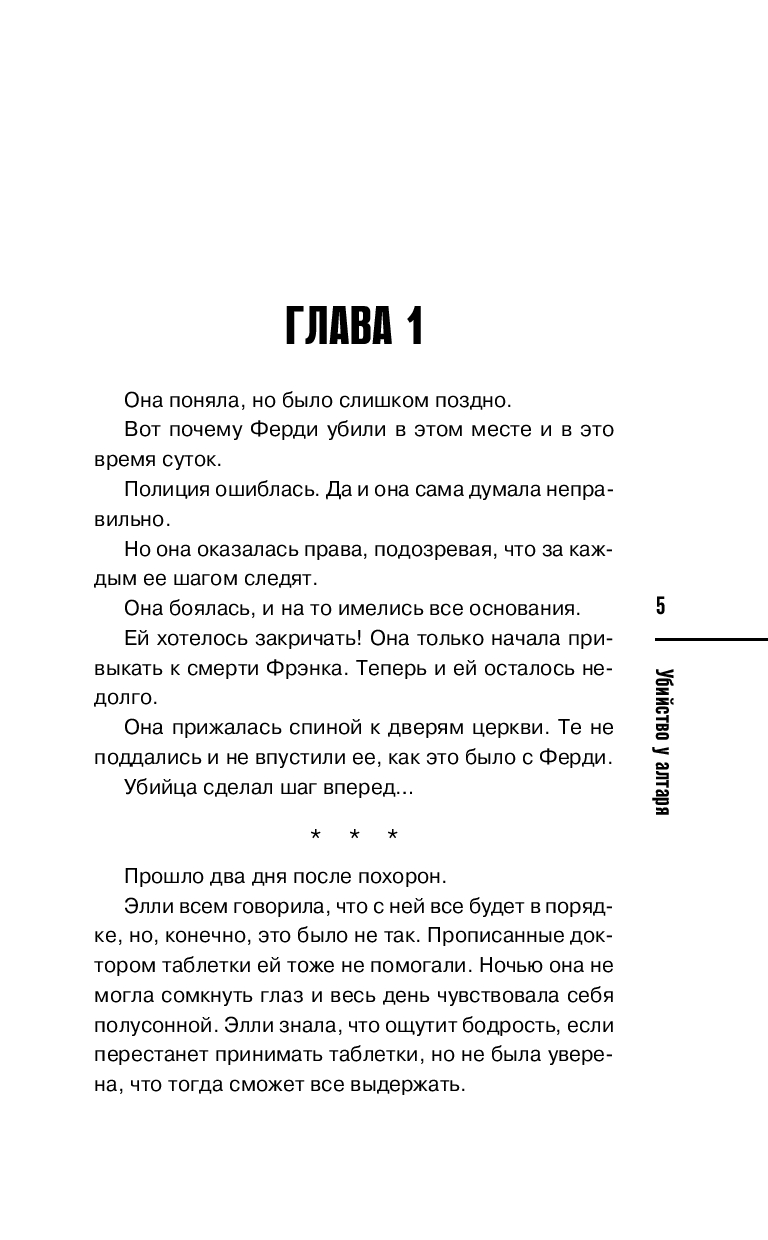 Полиция и мать погибшего убеждены, что Элли видела гораздо больше в ночь убийства, чем говорит. Но бедная старушка никак не может понять, к чему они клонят. Отбиваясь от чересчур назойливого внимания пастора, любящего заботиться о новоиспеченных вдовах, она решает защитить от детективов свою соседку, которую сделали главной подозреваемой, и выяснить правду.