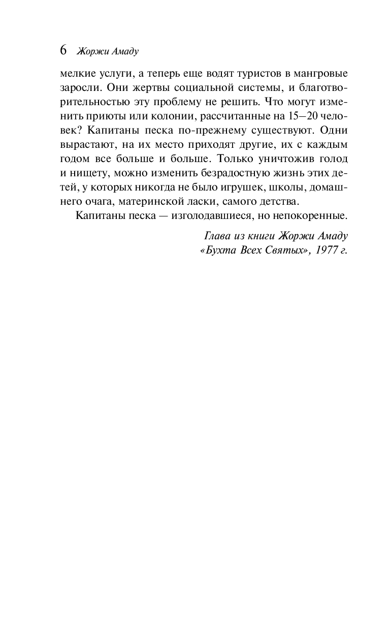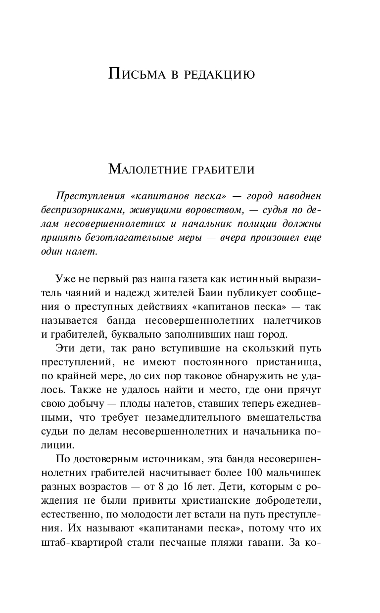"Капитаны песка не похожи на других детей… Они знают о жизни все, даже тайны любви… С самого детства они ведут жизнь взрослых мужчин". Они и жертвы социальной несправедливости и они же – единственные по-настоящему свободные люди в мире.