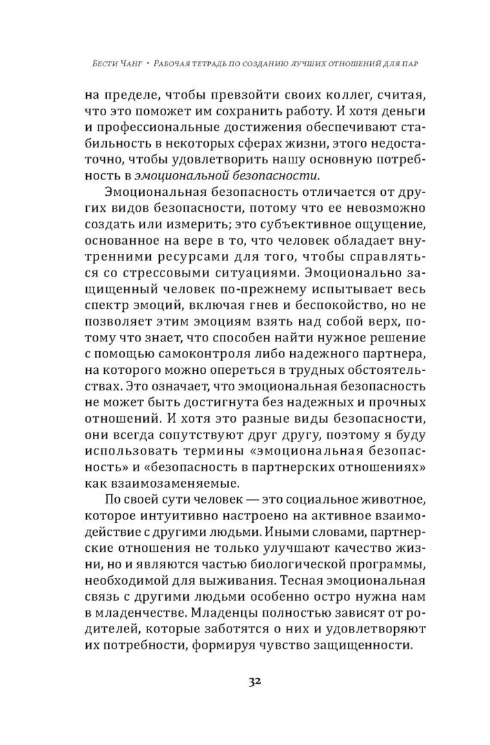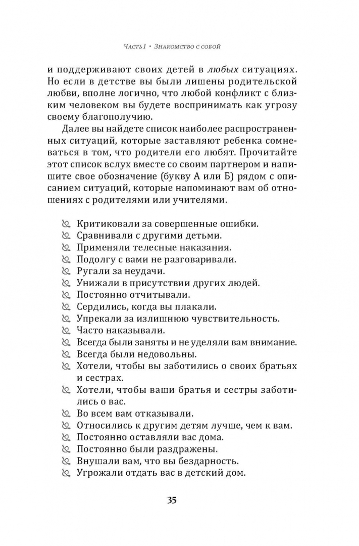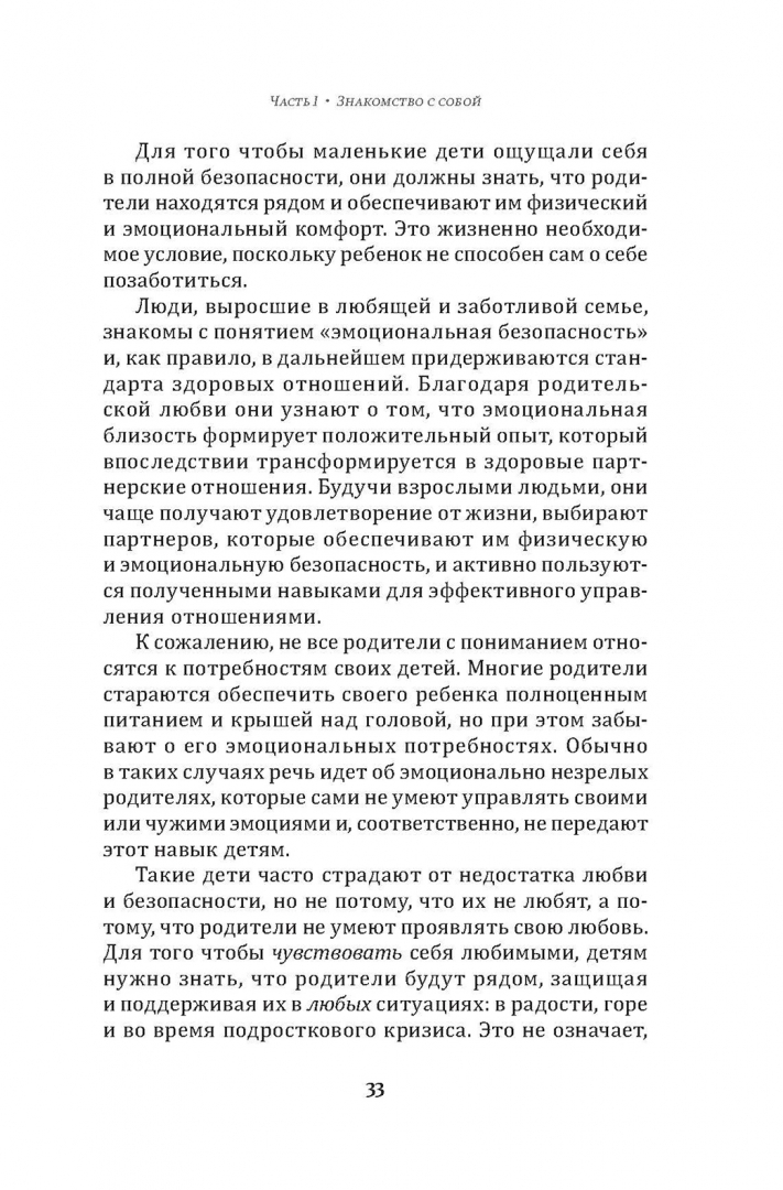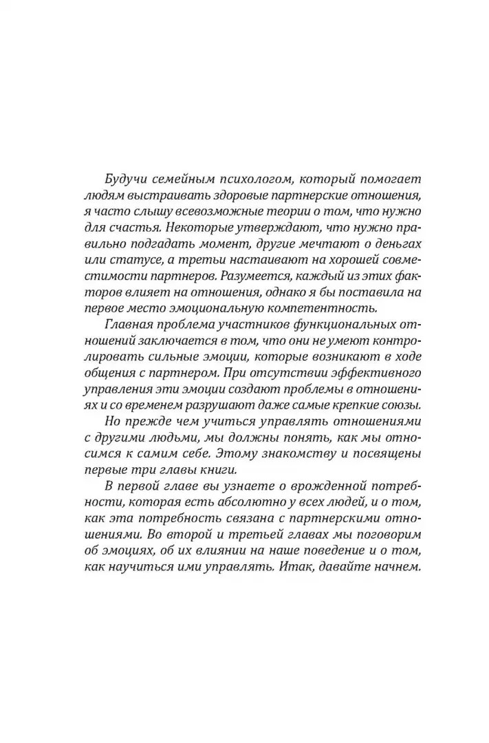 Рабочая тетрадь состоит из трех разделов. В первой части вам предстоит познакомиться со своим внутренним миром и потребностями, осознать, какие скрытые установки и модели поведения сейчас влияют на вашу жизнь. Во второй части Бетси описывает структуру здоровых осознанных отношений и техники, повышающие эмоциональный интеллект и создающие глубокую эмоциональную связь с партнером. Наконец, в третьей части вы узнаете о том, как применить изученные техники для разрешения конфликтов и преодоления проблемных ситуаций совместно с партнером.