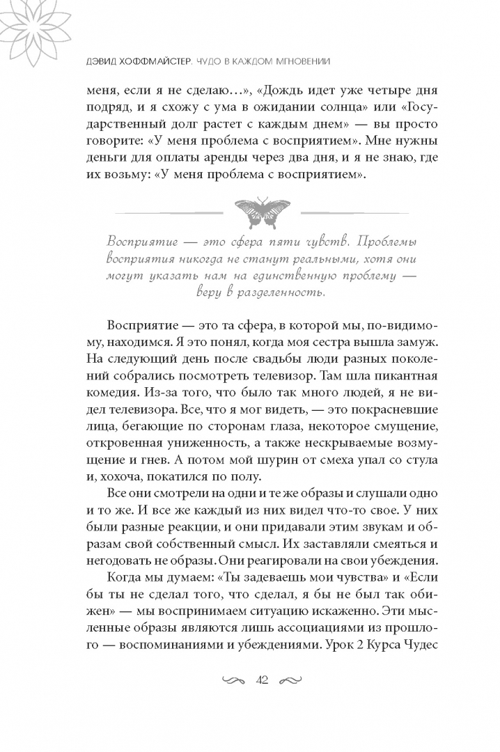 Книга "Чудо в каждом мгновении" построена по принципу изнутри вовне. Сначала Дэвид Хоффайстер предлагает проанализировать и проработать свои внутренние установки. А затем сознание, как кинопроектор, начнет проецировать их на окружающий мир.