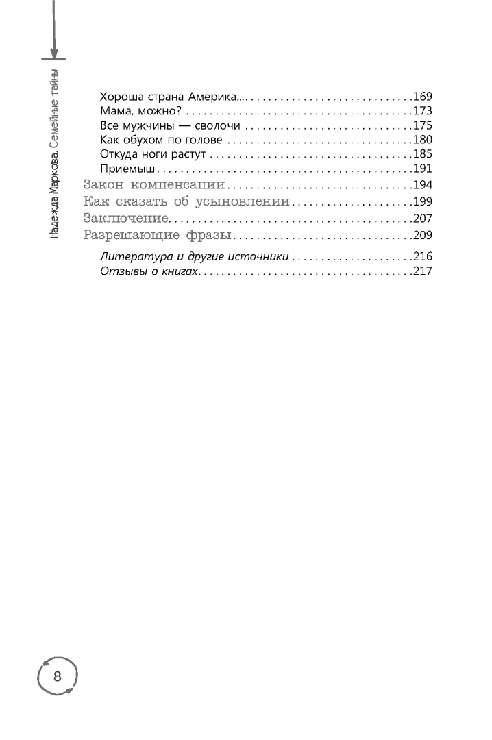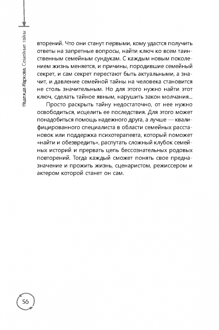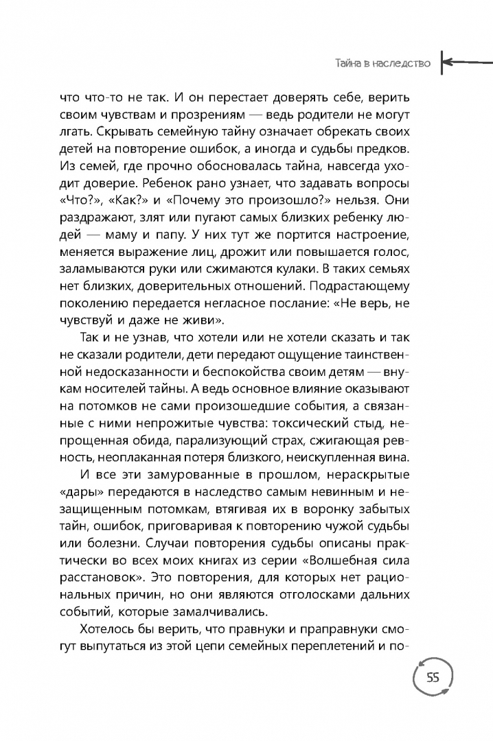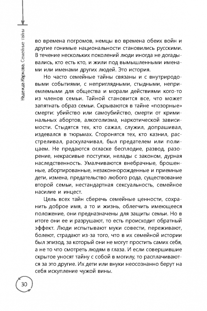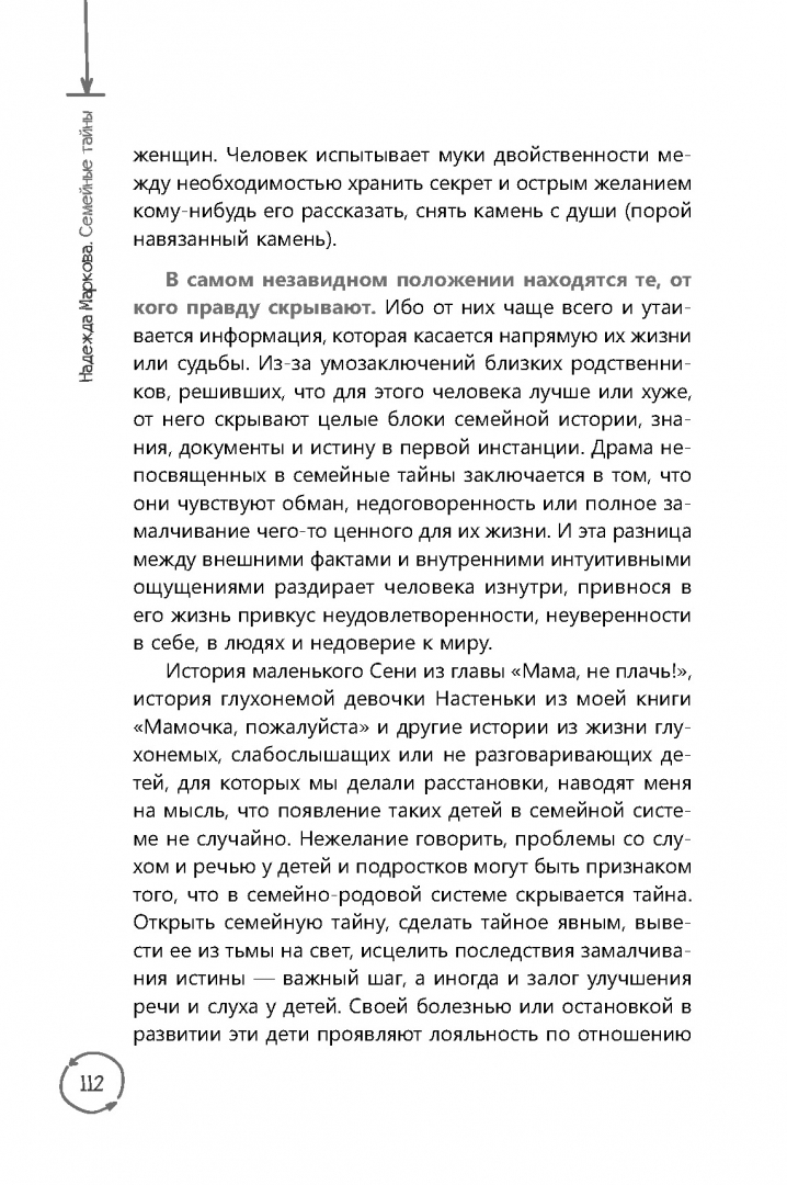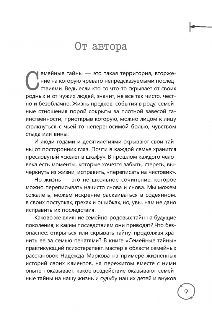 Надежда Маркова – психотерапевт с богатым опытом работы, автор бестселлеров по системным расстановкам. В книге она рассказывает, какие последствия для потомков могут быть, если скрывать от родственников тайны, которые относятся к истории вашего рода и, в случае раскрытия, могут запятнать образ семьи. Скрывают "позорные" смерти: убийство или самоубийство, смерти от криминальных абортов, алкоголизма, наркотической зависимости. Не предаются огласке бесплодие, развод, разорение, подлые поступки, нелады с законом, дурная наследственность. Умалчиваются брошенные, абортированные, незаконнорожденные и приемные дети, измена, предательство любого рода, насилие со стороны родственников.