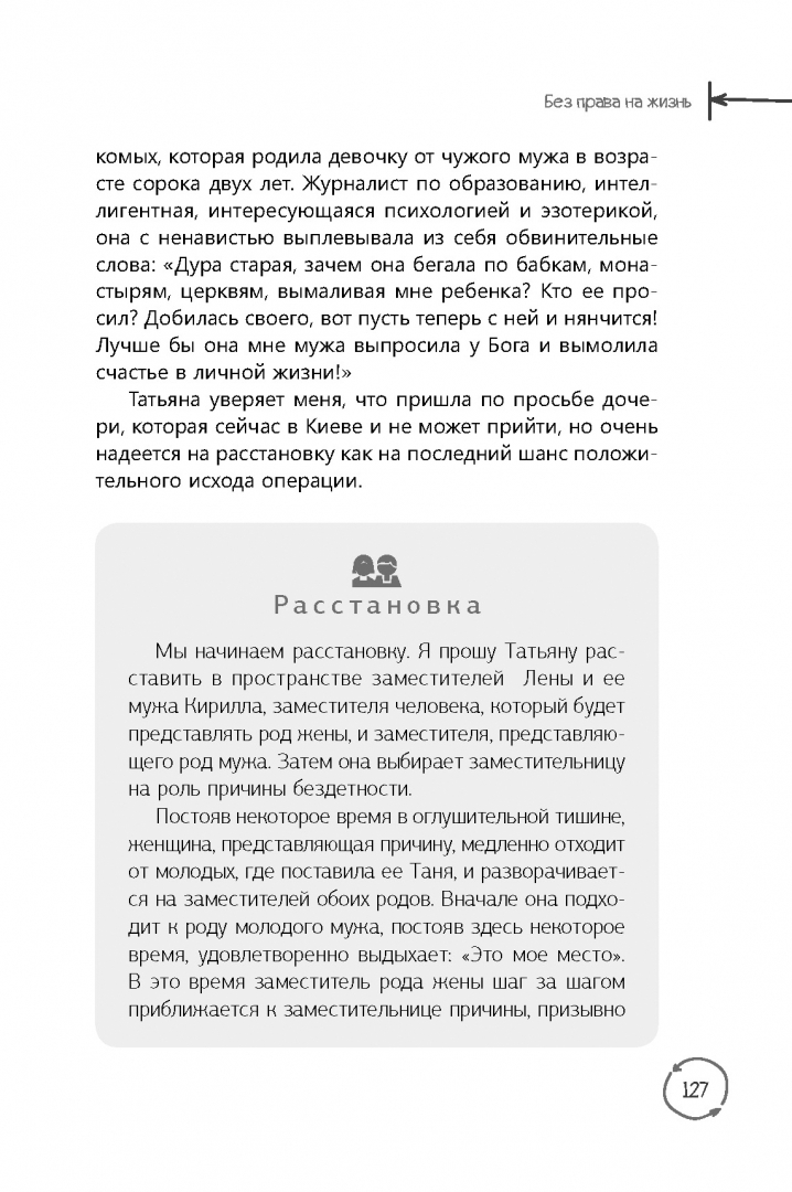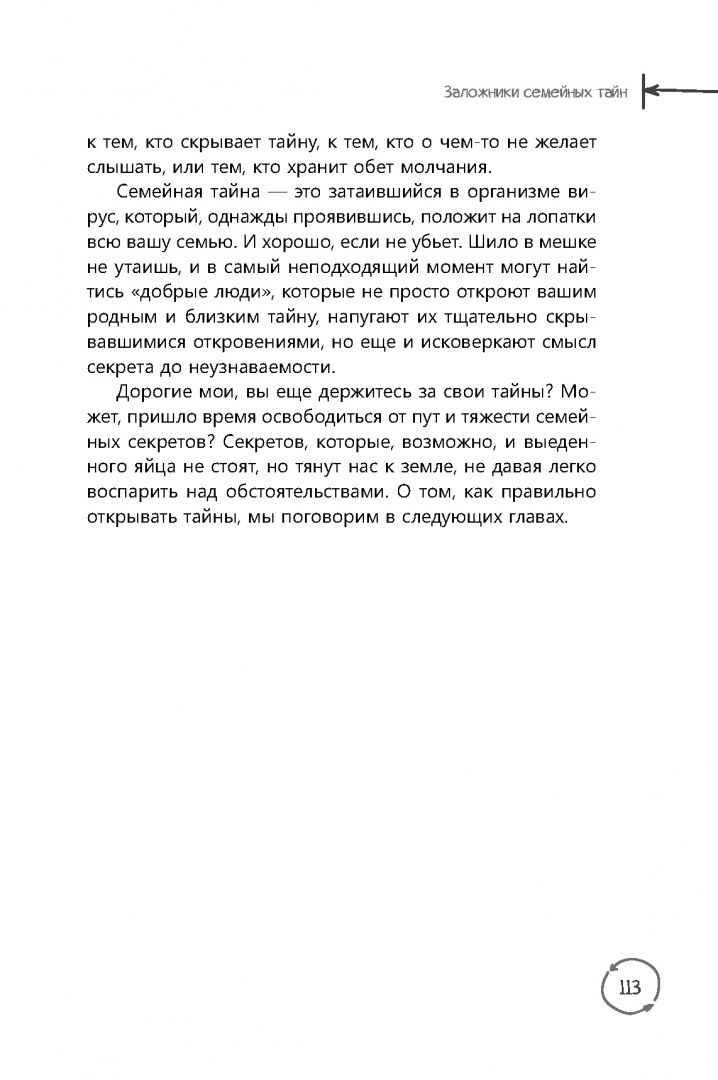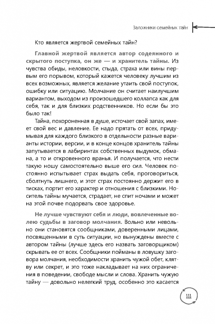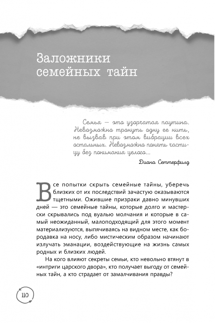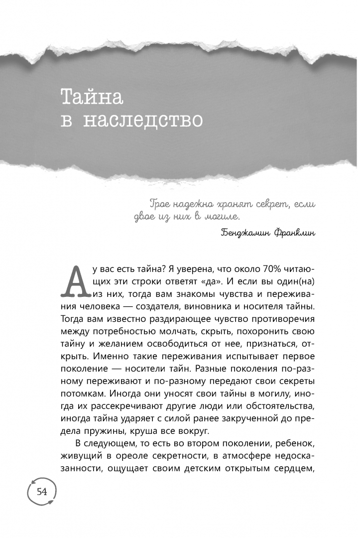 В этой книге вы увидите на примере жизненных историй клиентов автора и проведенных для них расстановочных сессий, как тайны ныне живущих или уже умерших родственников влияют на нашу жизнь и судьбу наших детей и внуков. Вы узнаете, что безопаснее для вас и рода – открыться или скрывать тайну, как не стать заложником секретного заговора молчания, как нейтрализовать разрушающие последствия тайны и очистить род от влияния далекого прошлого семьи. В приложении представлены разрешающие фразы, облегчающие психоэмоциональное состояние, к ним можно обращаться вне контекста расстановок.