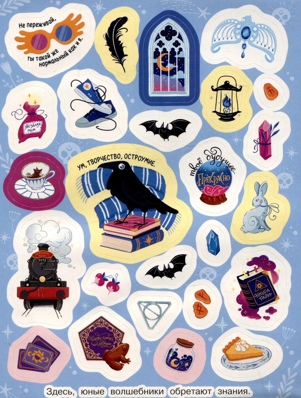 В наборе сто самых разных волшебных стикеров-артефактов для настоящего мага. Наклейками можно украсить ежедневник, тетради, скетчбук, телефон и многое другое!