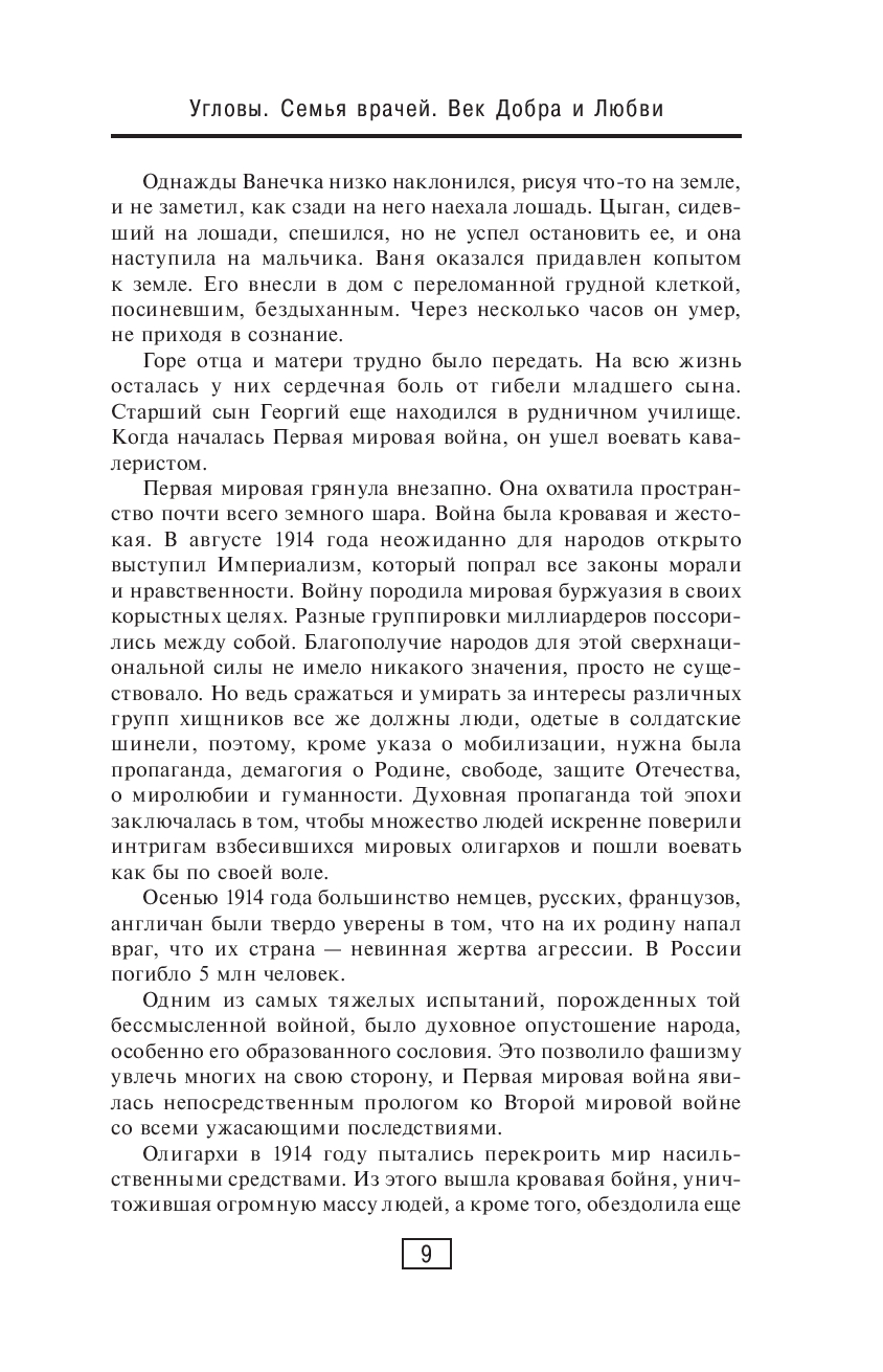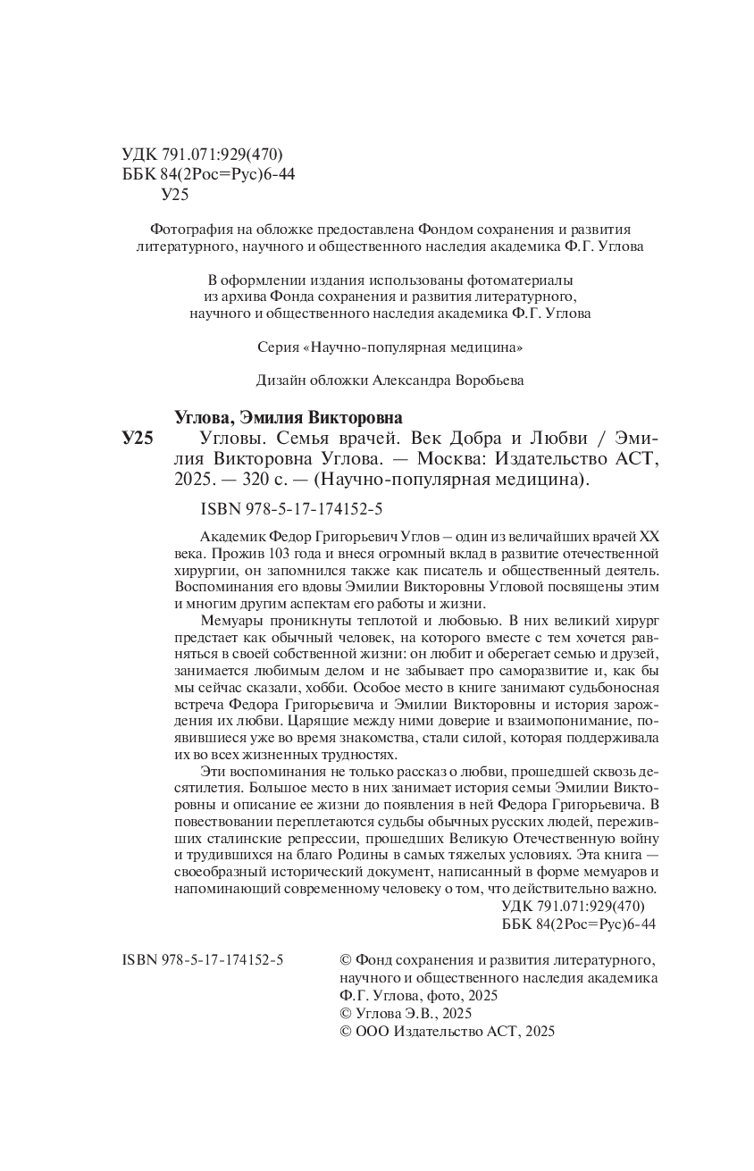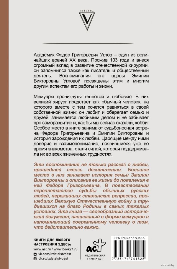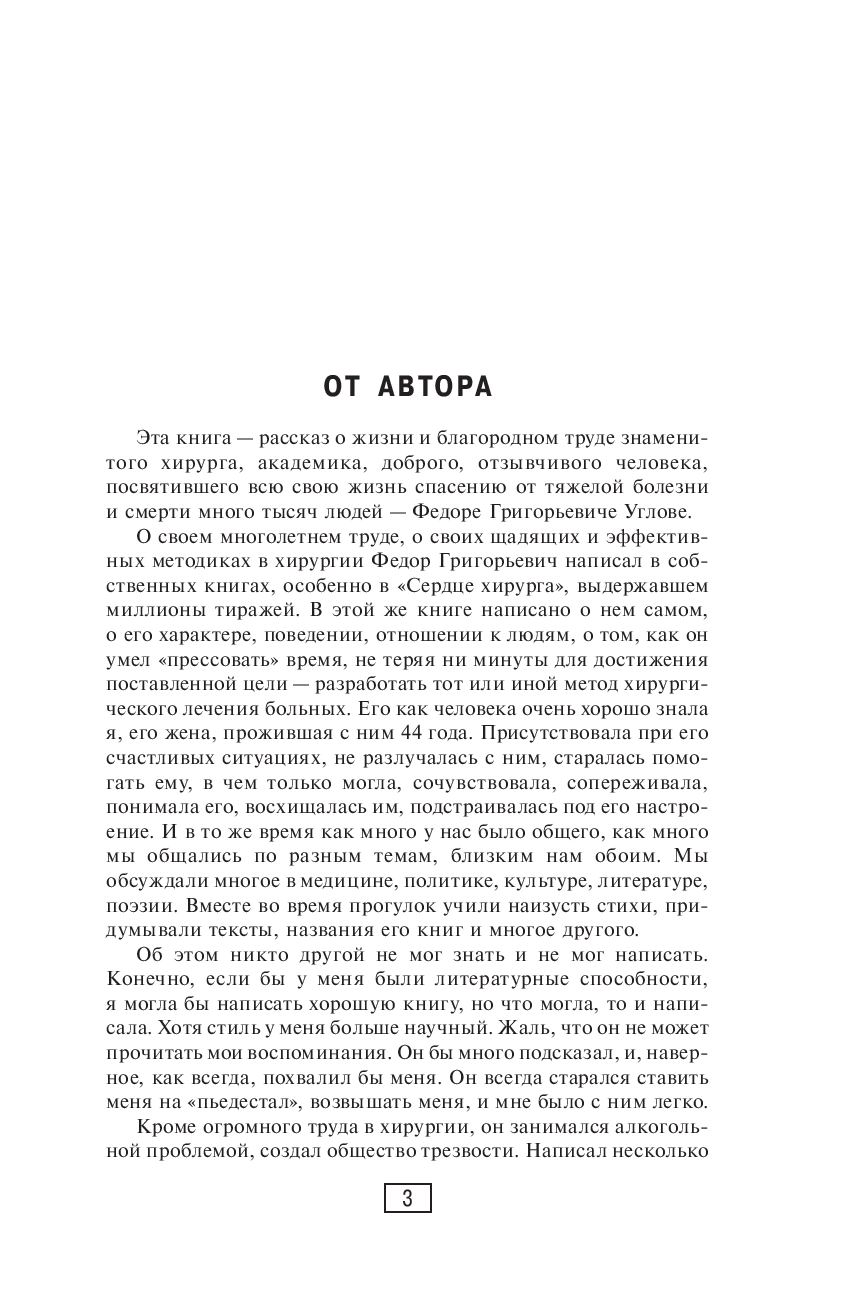 Академик Федор Григорьевич Углов – один из величайших врачей XX века. Прожив 103 года и внеся огромный вклад в развитие отечественной хирургии, он запомнился также как писатель и общественный деятель. Воспоминания его вдовы Эмилии Викторовны Угловой посвящены этим и многим другим аспектам его работы и жизни.