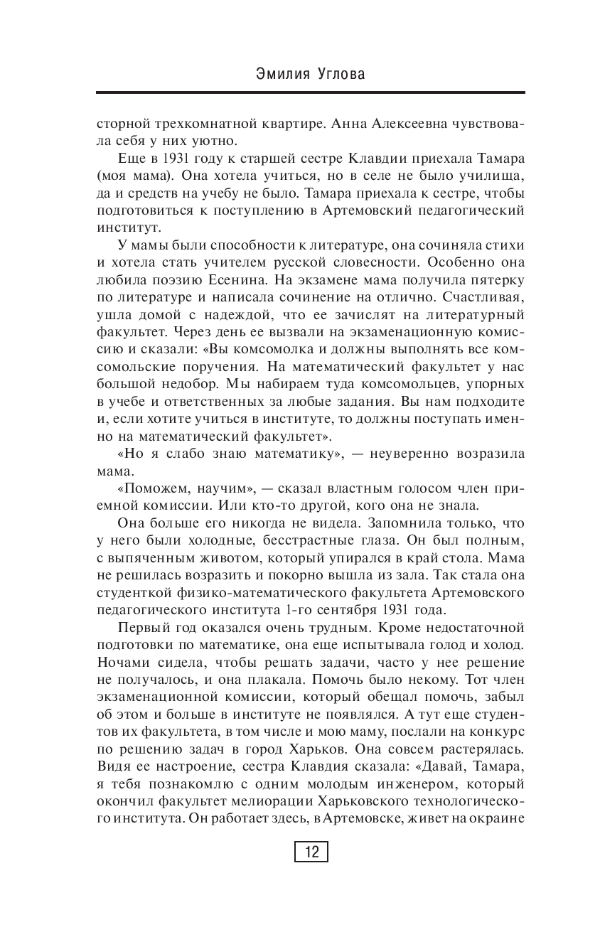 Эти воспоминания не только рассказ о любви, прошедшей сквозь десятилетия. Большое место в них занимает история семьи Эмилии Викторовны и описание ее жизни до появления в ней Федора Григорьевича. В повествовании переплетаются судьбы обычных русских людей, переживших сталинские репрессии, прошедших Великую Отечественную войну и трудившихся на благо Родины в самых тяжелых условиях. Эта книга – своеобразный исторический документ, написанный в форме мемуаров и напоминающий современному человеку о том, что действительно важно.