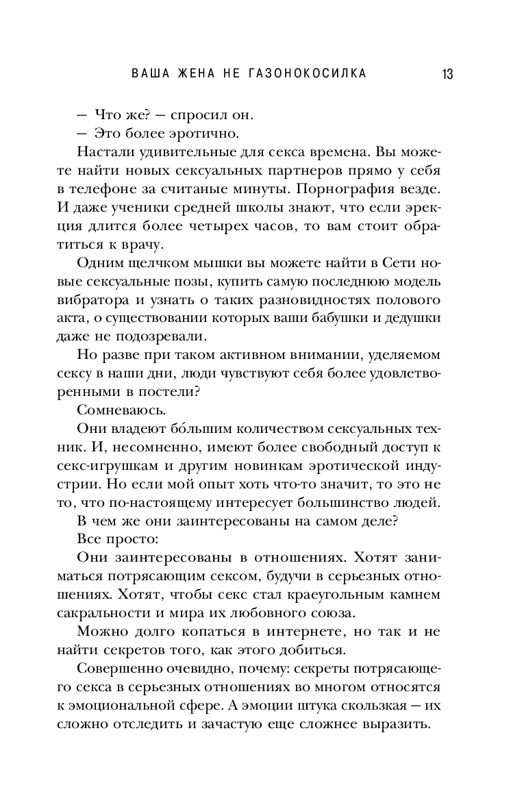 Автор поднимает множество животрепещущих вопросов о человеческой сексуальности в паре: как вернуть былую страсть, как заглушить стремление довести партнера до оргазма и просто насладиться процессом, он объясняет, как важно проявлять инициативность и при чем здесь секс крыс. Снайдер считает: для того, чтобы наладить свою сексуальную жизнь, нужно сперва разрешить фундаментальные проблемы сексуального «я», стремящего найти самого себя, наконец избавиться от внутренних стереотипов и позволить инстинктам взять верх.
