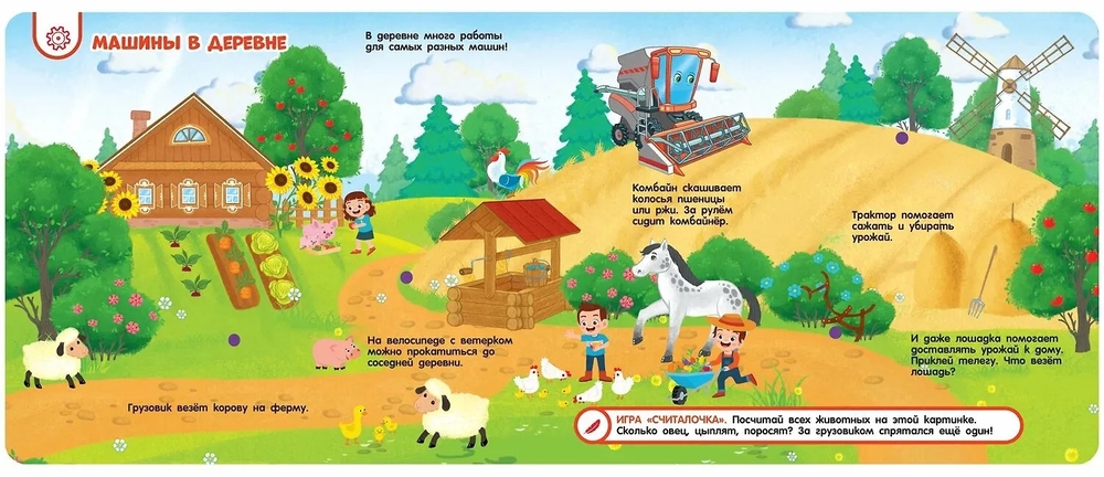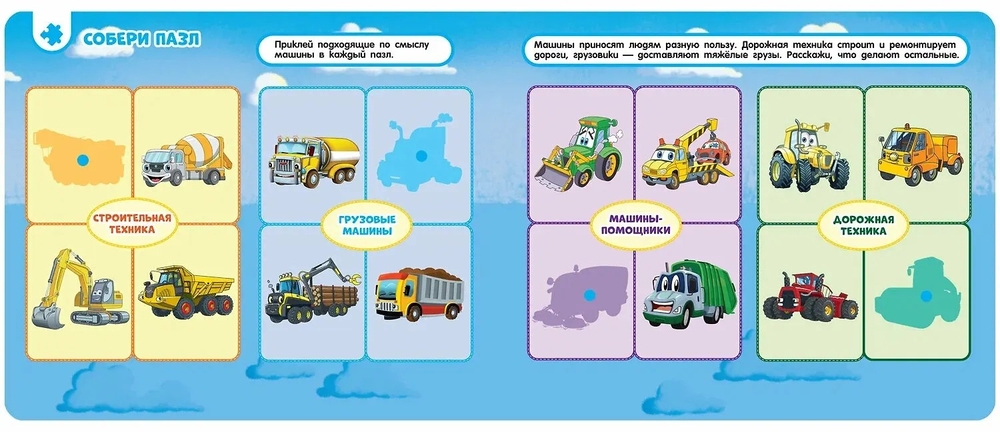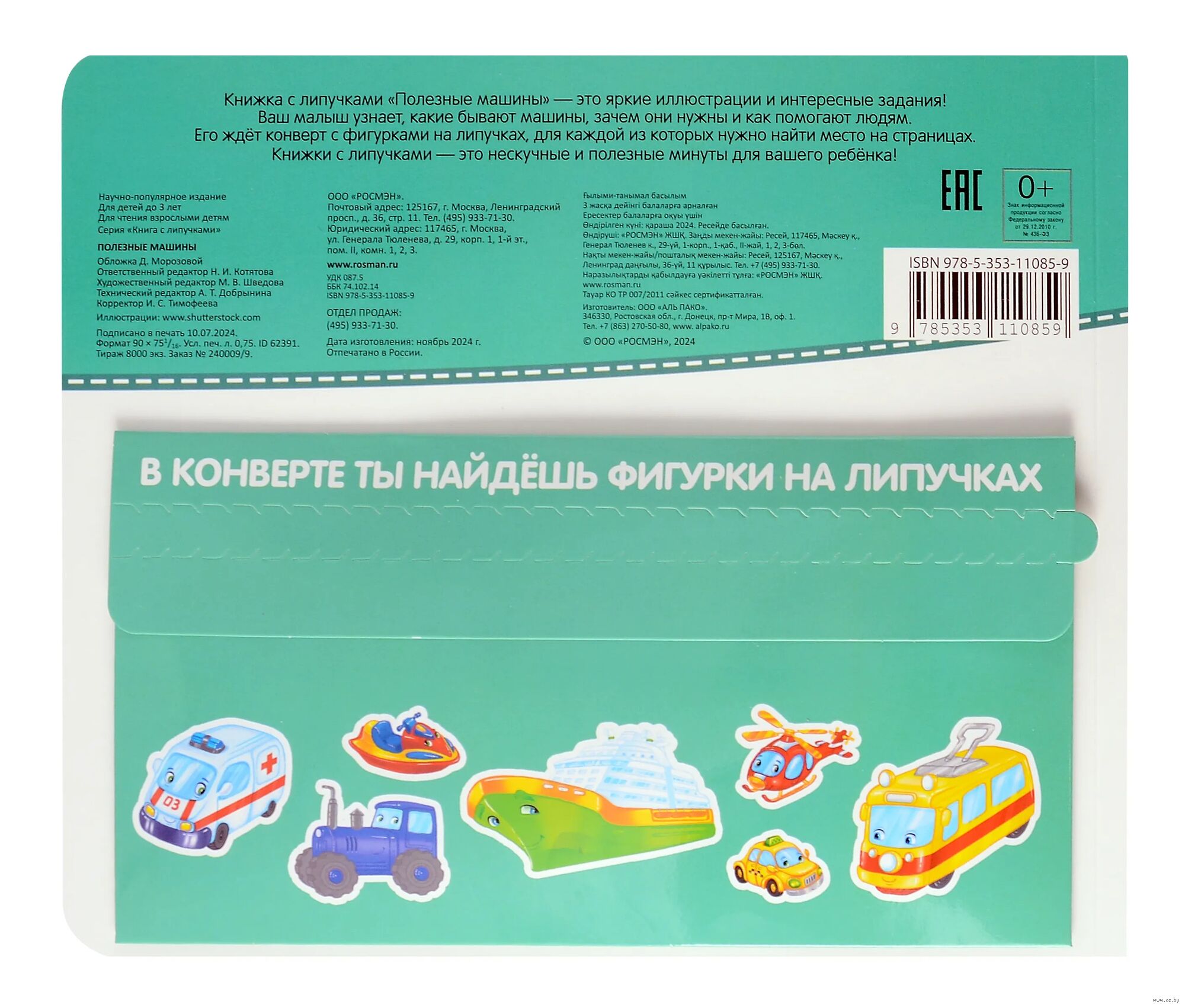 Занимаясь вместе со взрослым, ребенок узнает много нового об окружающем мире, а также познакомится с машинами-помощниками людей: грузовиком, трактором, пожарной машиной, автобусом и другими. Фигурки на липучках хранятся в отдельном конверте на оборотной стороне обложки, поэтому книжку-игрушку удобно брать в дорогу и в садик. Для каждого изображения нужно найти свое место на страницах.