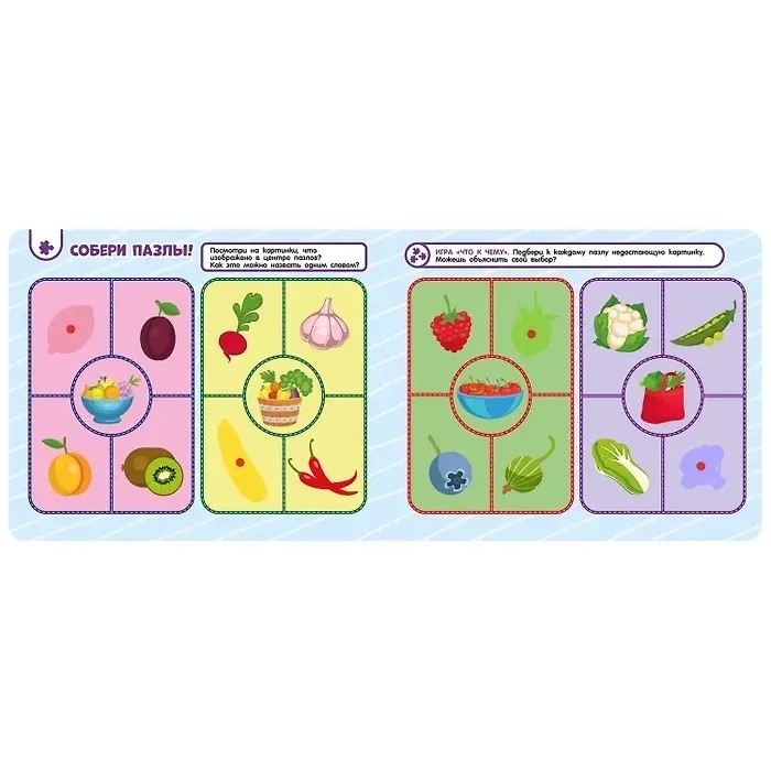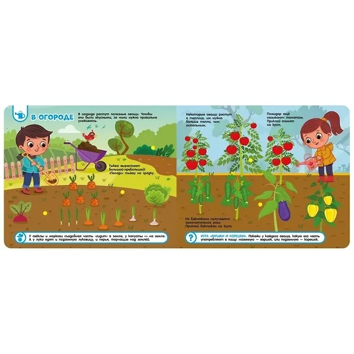 Занимаясь вместе со взрослым, ребенок узнает много нового об окружающем мире, а также как где растут и как выглядят разные фрукты и овощи. Фигурки на липучках хранятся в отдельном конверте на оборотной стороне обложки, поэтому книжку-игрушку удобно брать в дорогу и в садик. Для каждого изображения нужно найти свое место на страницах.
