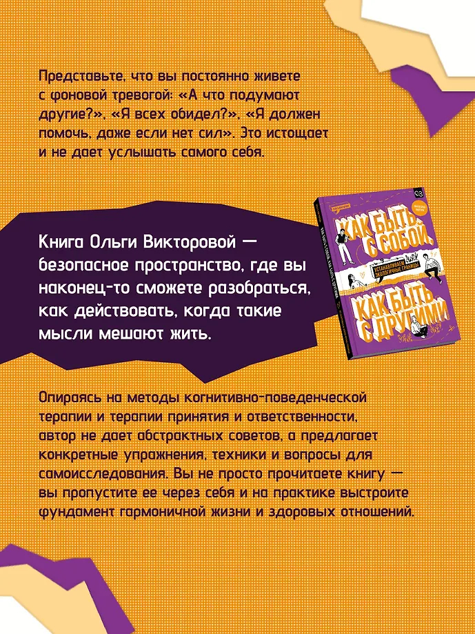 "Как быть с собой, как быть с другими" – практическое руководство по выстраиванию здоровых отношений с собой и окружающими. Личные границы – это не просто умение говорить "нет", а фундамент для гармоничной жизни, где есть место и себе, и другим.