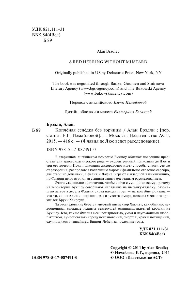 За расследование берется упертый инспектор Хьюитт, как обычно, недооценивая сыскные таланты вездесущей одиннадцатилетней крошки из Букшоу. Кто как не Флавия с ее настырностью, умом и неугомонным любопытством сумеет связать череду исчезновений, смертей, краж и похищений, случившихся в тишайшем Бишоп-Лейси за последние годы.