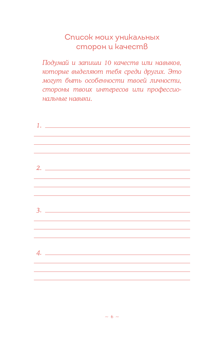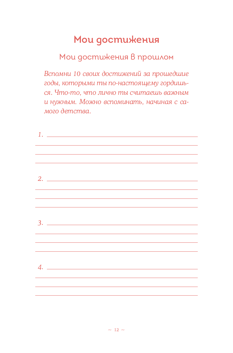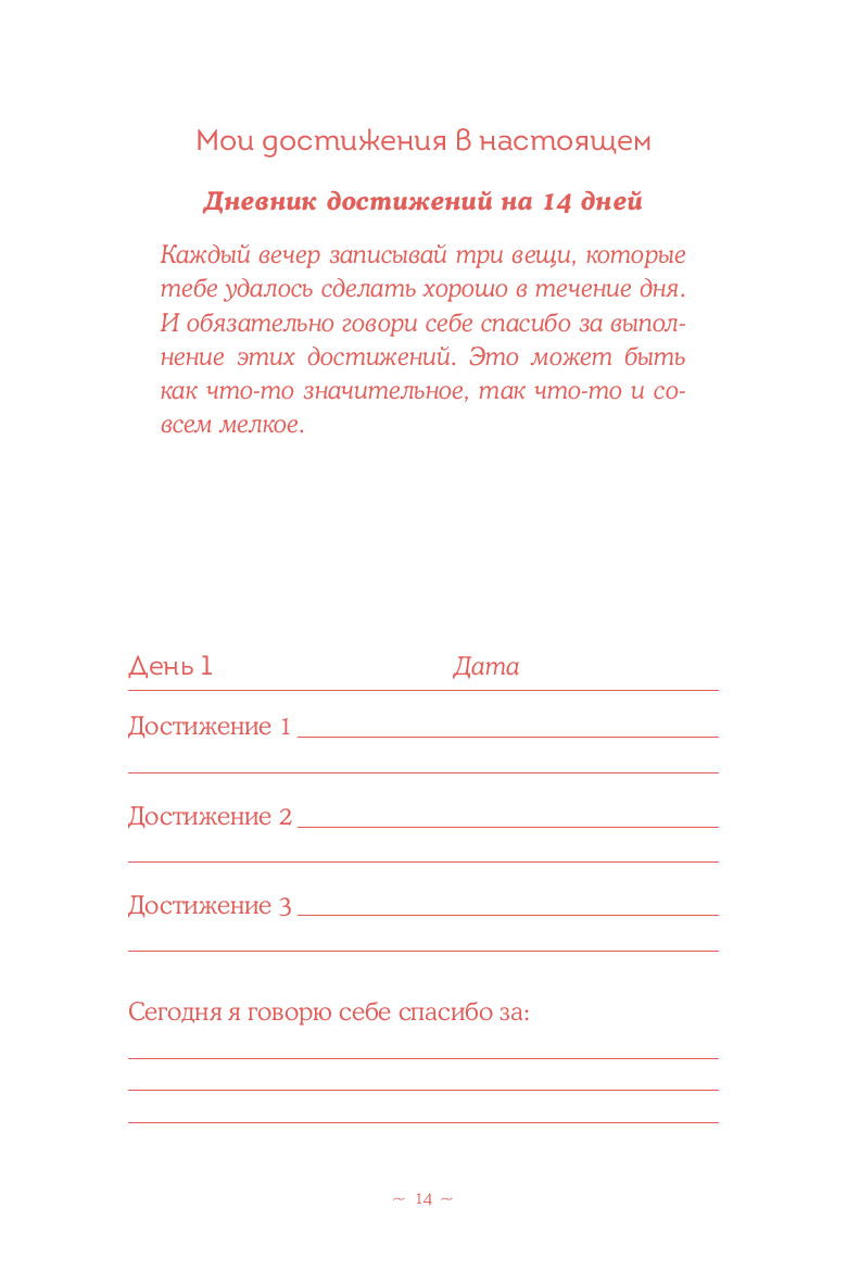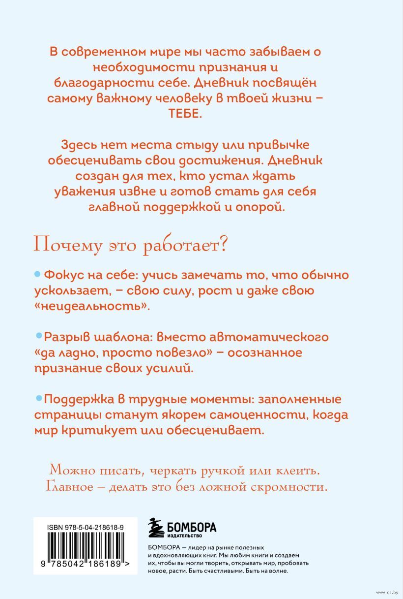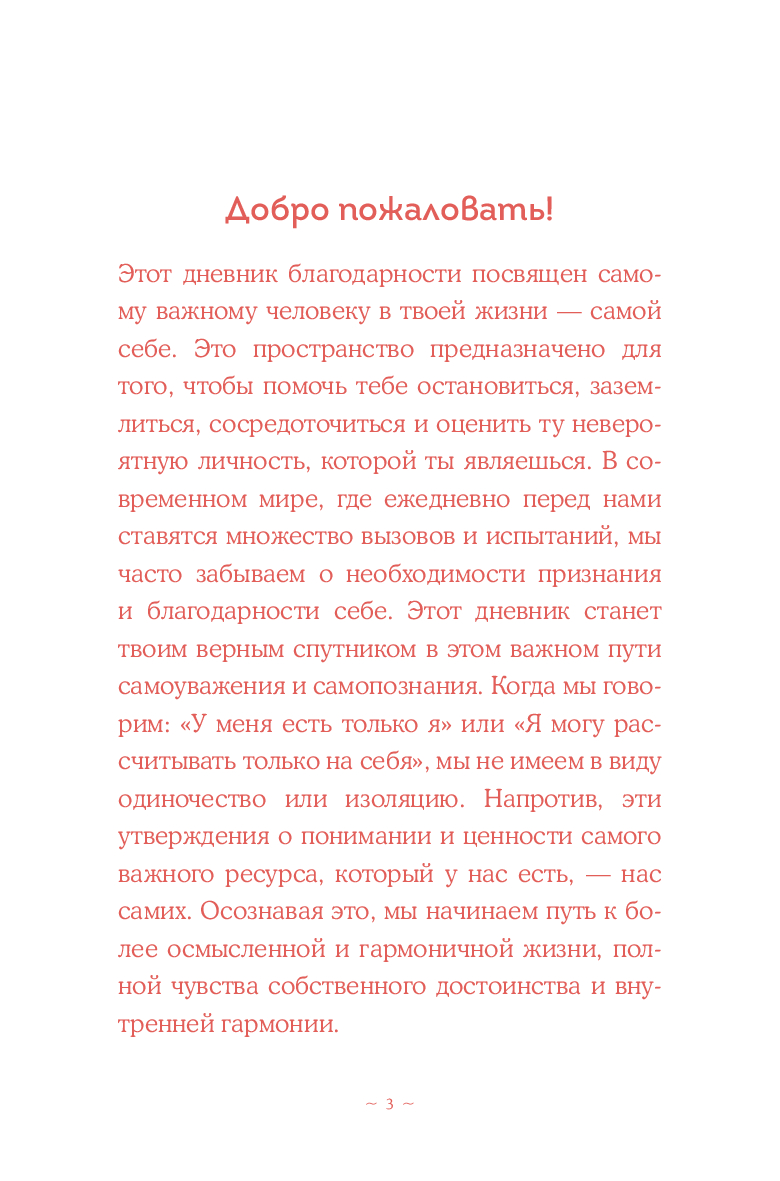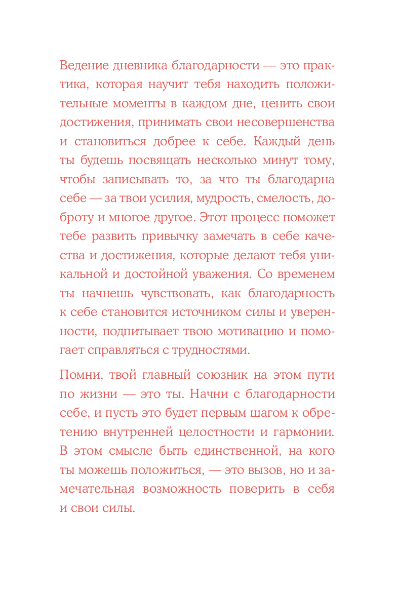 В современном мире мы часто забываем о необходимости признания и благодарности себе. Этот дневник благодарности посвящён самому важному человеку в твоей жизни – ТЕБЕ. Здесь нет места стыду или привычки обесценивать свои достижения. Он создан для тех, кто устал ждать уважения из вне и готов стать себе главной поддержкой и опорой. Он предназначен для того, чтобы помочь тебе остановиться, заземлиться, сосредоточиться и оценить ту невероятную личность, которой ты являешься. Этот дневник станет твоим верным спутником в этом важном пути к самоуважению и самоценности.
