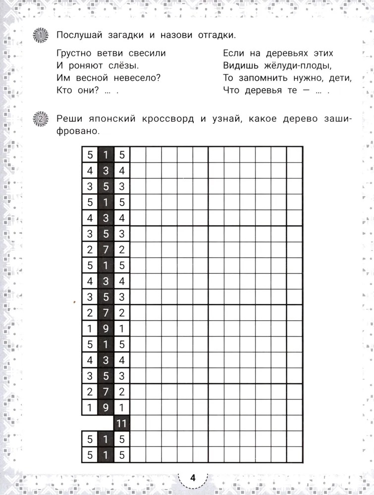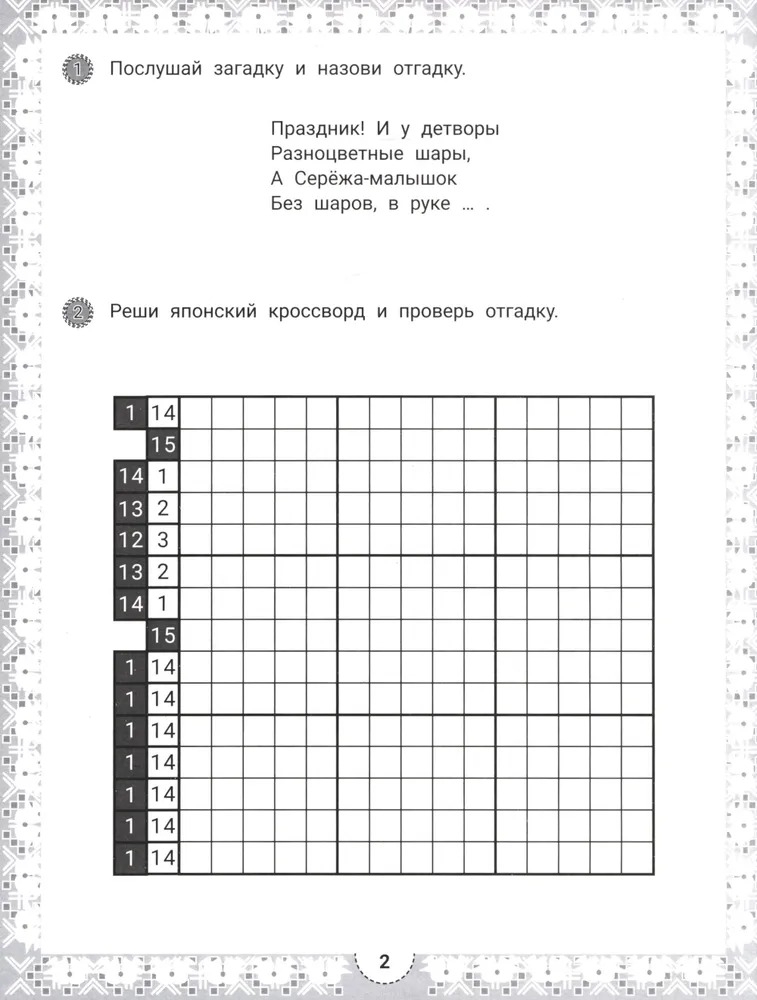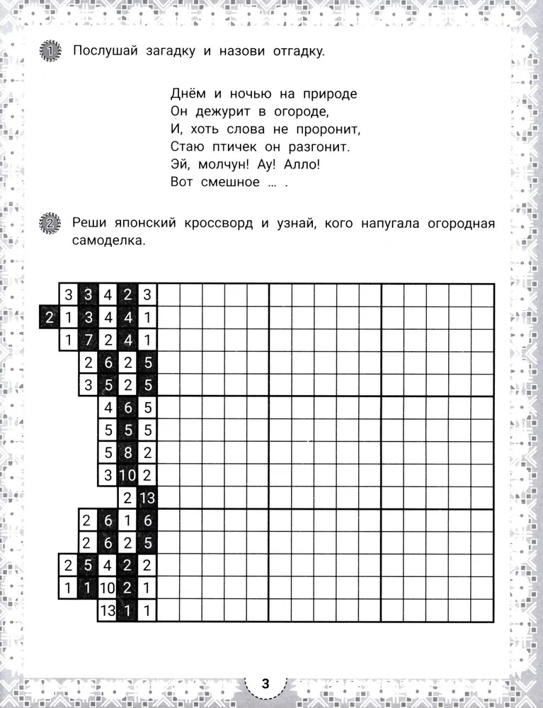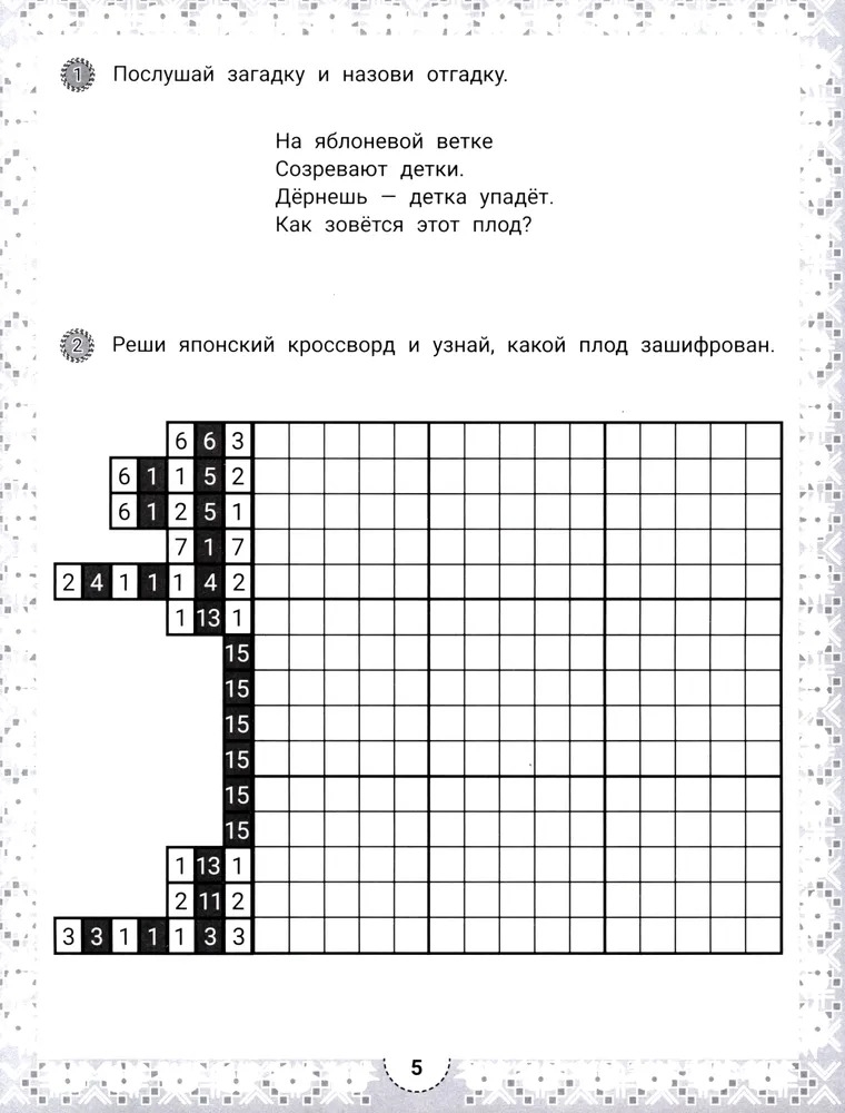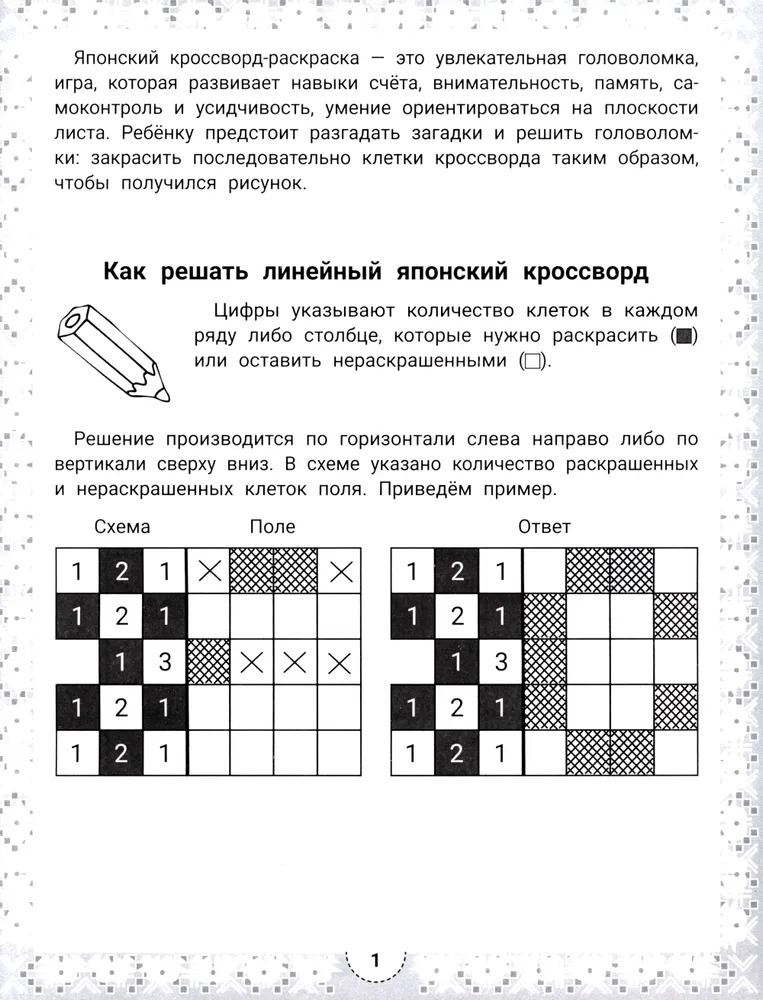 Японский кроссворд – это увлекательная головоломка, в которой зашифрованы не слова, а изображения. Умная раскраска с загадками развивает у ребёнка навыки счёта, внимательность, память, самоконтроль и усидчивость, умение ориентироваться на плоскости листа.