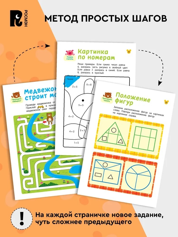 Развивающее пособие составлено по методу простых шагов: задания постепенно усложняются, чтобы малыш видел свои успехи и с удовольствием брался за новые игры. Так ребенок научится решать логические задачи и отработает сложные движения кисти, которые в будущем пригодятся на уроках письма.