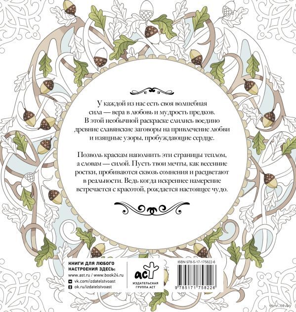 У каждой из нас есть своя волшебная сила – вера в любовь и мудрость предков. В этой необычной раскраске слились воедино древние славянские заговоры на привлечение любви и изящные узоры, пробуждающие сердце.