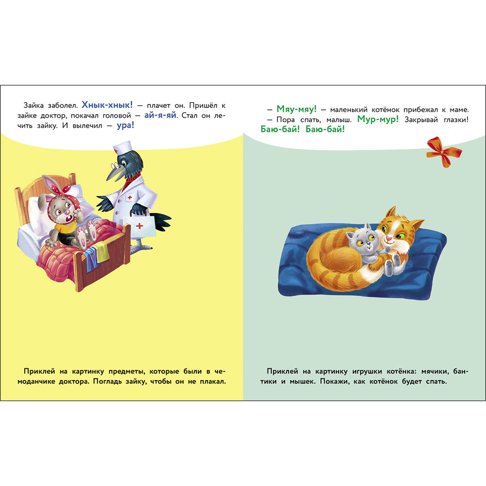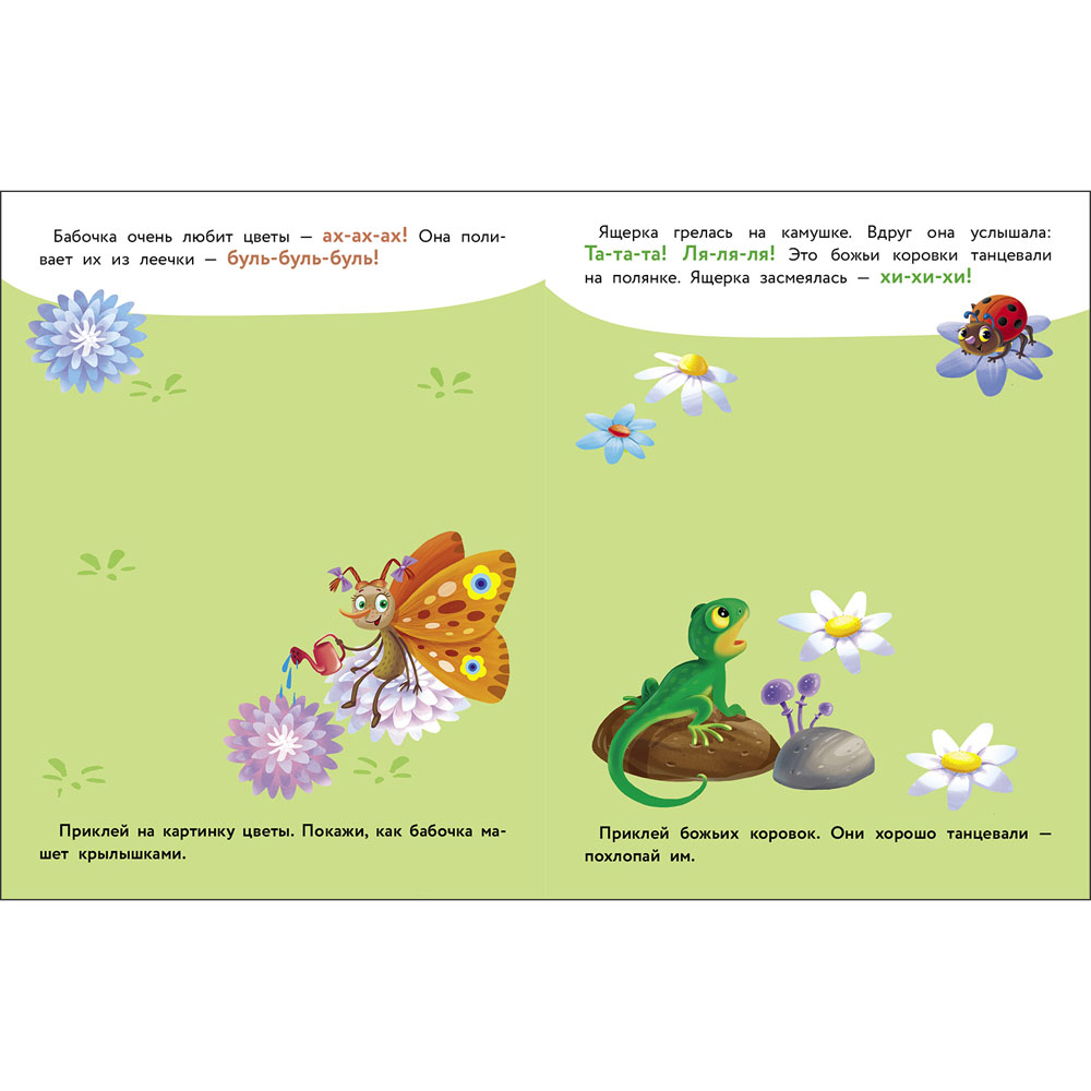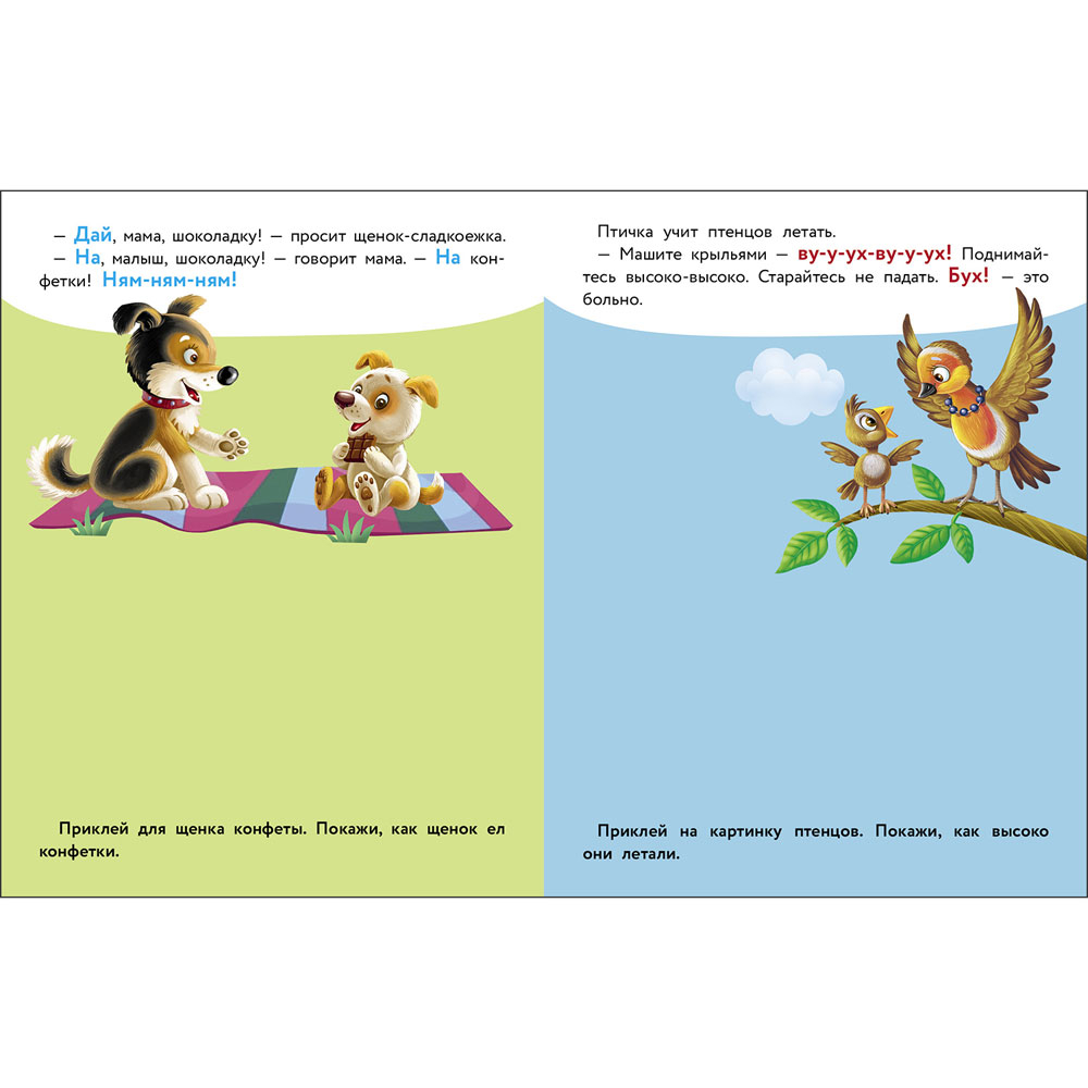 Эта книга адресована самым маленьким читателям, которые ещё только-только начинают говорить. Для запуска речи нужно играть с малышом, разговаривать с ним, акцентируя внимание на самых простых словах. Полезно “озвучивать” предметы, рассказывайте ребёнку, как разговаривают животные. В этой книжке собраны небольшие истории со специально подобранными словами. А ещё в книге есть наклейки. Они очень простые по форме. Малышу будет удобно приклеивать их на картинки. Работа с наклейками – отличный способ развивать мелкую моторику и, соответственно, речь.