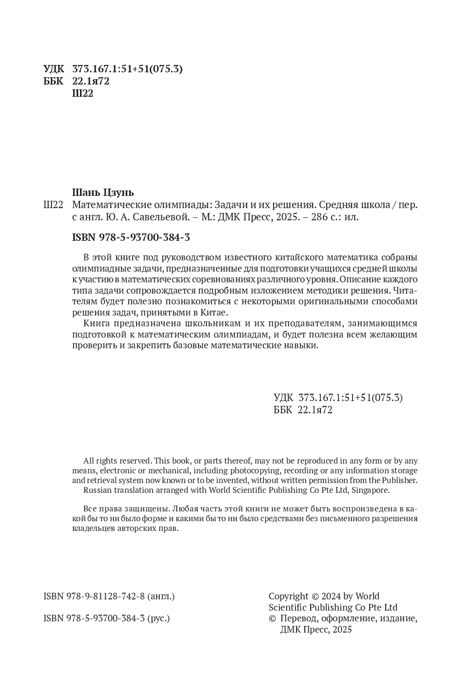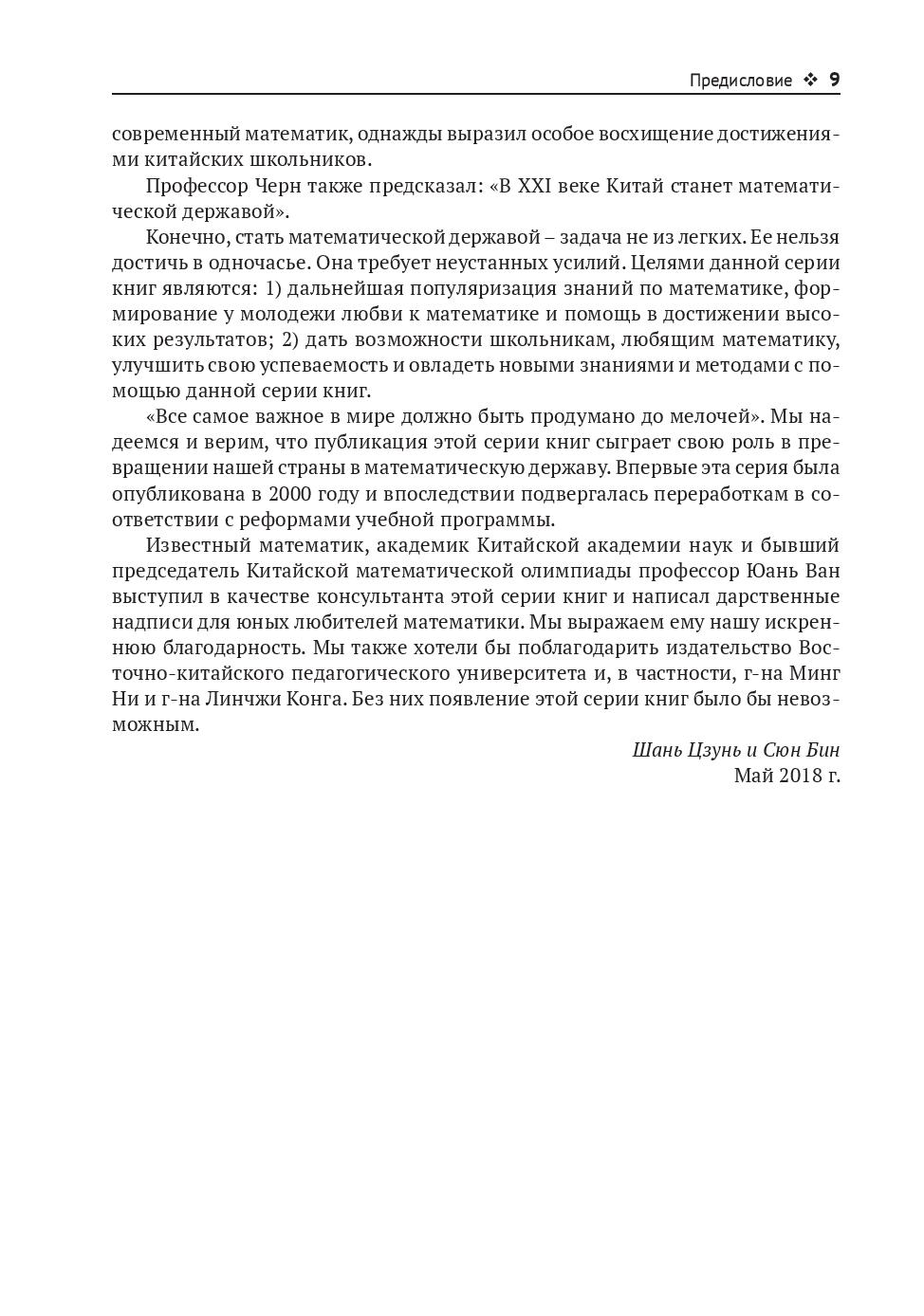 В книге собраны олимпиадные задачи, предназначенные для подготовки учащихся средней школы к участию в математических соревнованиях различного уровня. Описание каждого типа задачи сопровождается подробными методиками решения. Читателям будет полезно познакомиться с оригинальными способами решения задач, принятыми в Китае, и убедиться, что секрет успеха кроется в сочетании трудолюбия, тщательно отработанных навыков и правильно подобранных методических материалов.