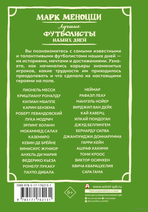 Биографии самых ярких звёзд современного футбола: от Лионеля Месси и Криштиану Роналду до Каземиро и Неймара, от Килиана Мбаппе и Карима Бенземы до Луки Модрича и Федерико Кьезы.