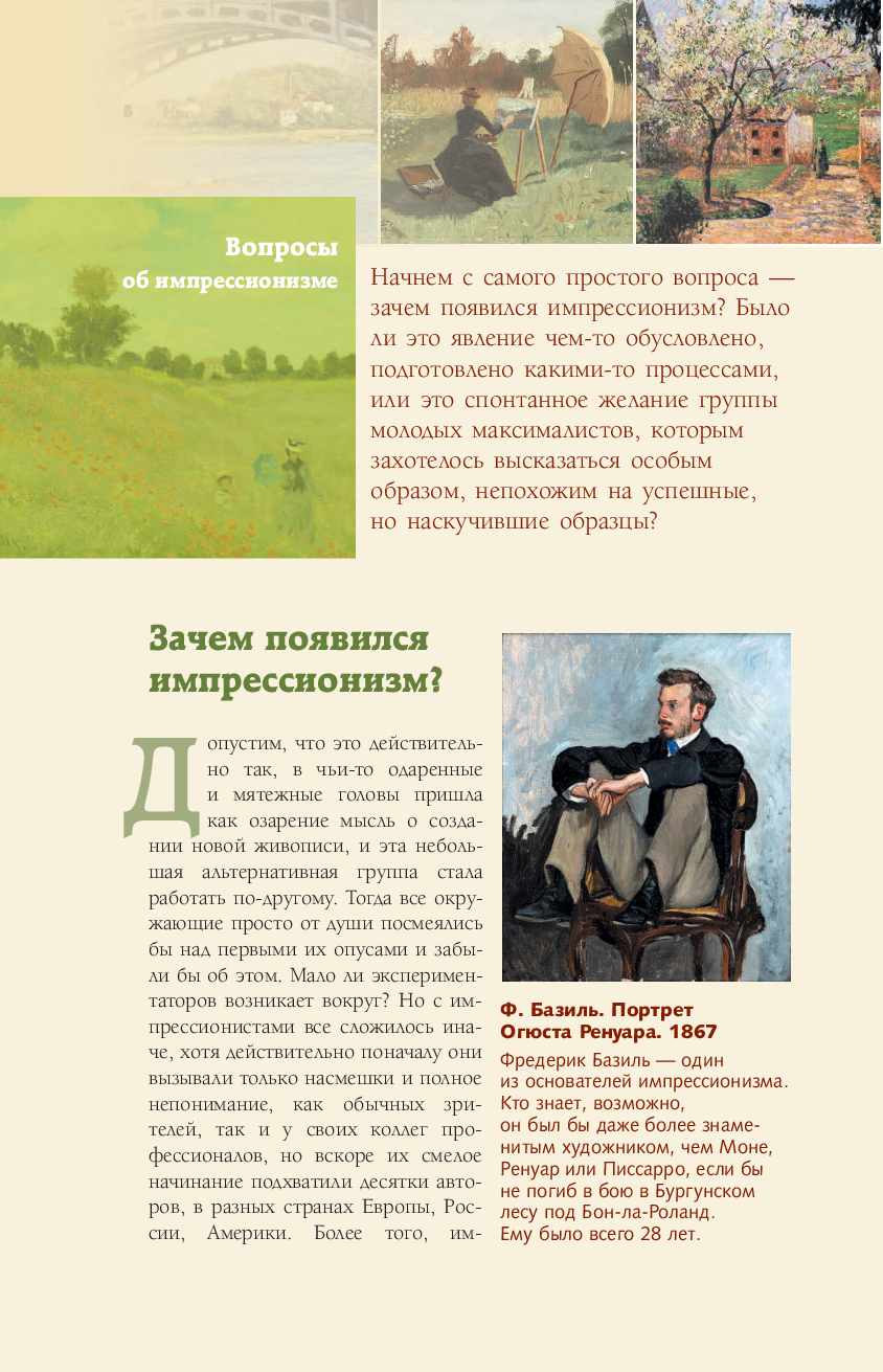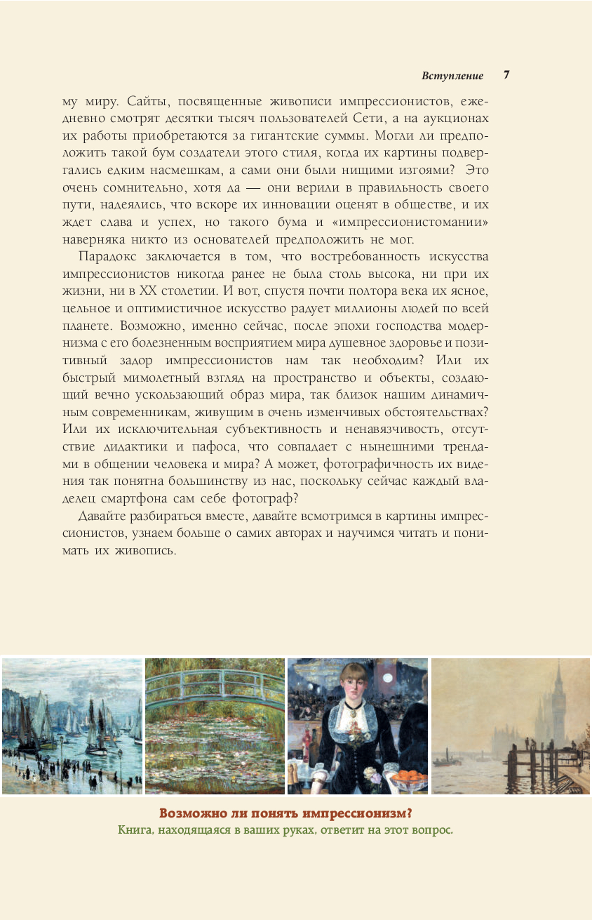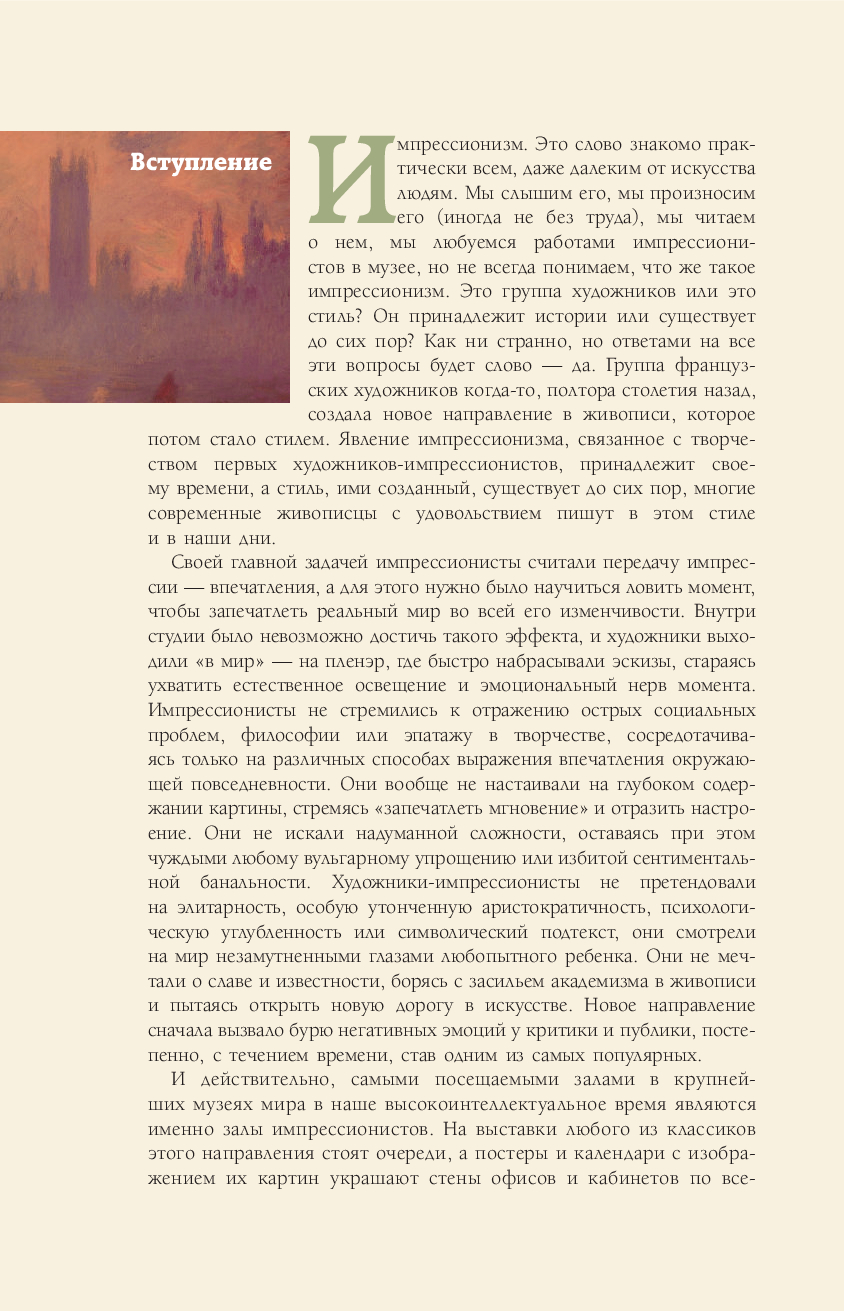 Импрессионизм. Это слово знакомо почти всем, даже далеким от искусства людям. Мы часто слышим его, читаем о нем, посещаем выставки художников-импрессионистов, но не всегда понимаем, чем же нас так привлекает эта легкая и вибрирующая живопись, этот вихрь пастельных красок, верно ухваченный, почти фотографический момент времени. Вы хотите разбираться в импрессионизме и знать о нем больше? Эта красочная книга, снабженная множеством великолепных иллюстраций и интересным, содержательным текстом, поможет вам в этом.