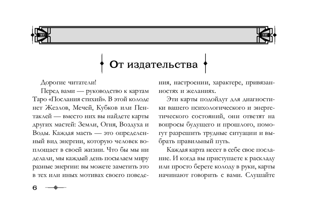 Автор, Лариса Ренар, убеждена, что каждая стихия учит нас своим урокам. Стихии Огонь и Воздух – активные. Они помогают быть решительнее, смелее, быстрее находить общий язык с другими людьми. А Земля и Вода – стихии пассивные. Благодаря их воздействию вы станете более мягкими, "текучими", укорененными. Изучайте "характеры" стихий, прислушивайтесь к их посланиям, делайте расклады – и вы увидите, что окружающий мир всегда говорил с вами, просто раньше вы этого не замечали.