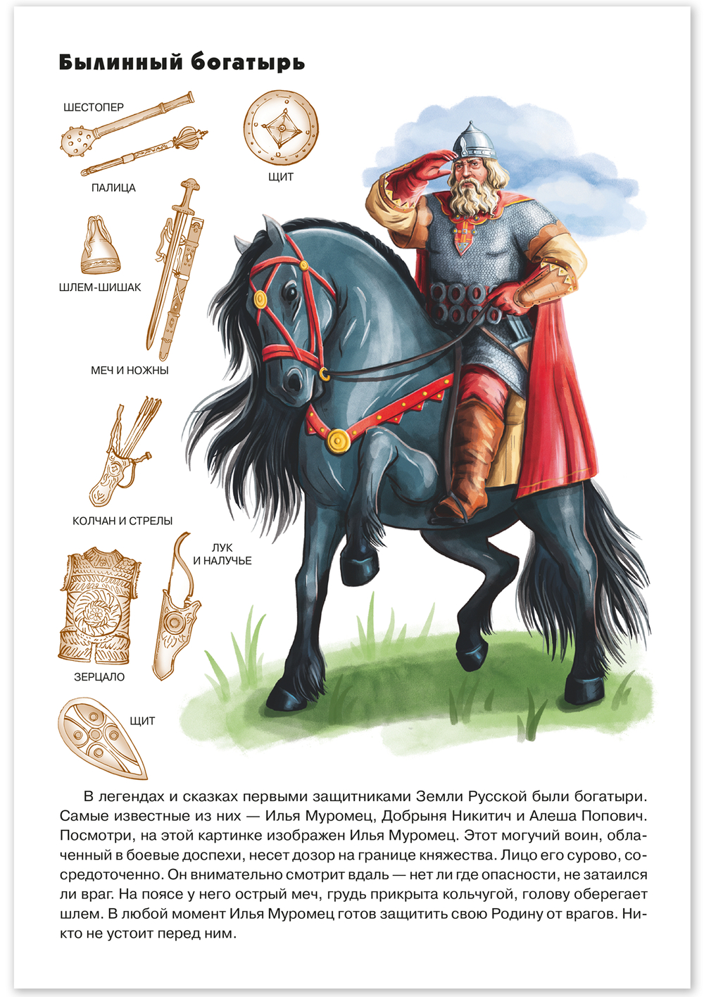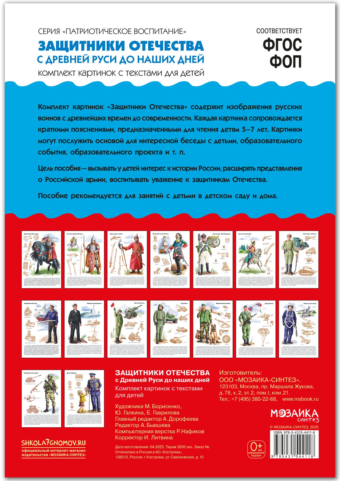 Комплект картинок "Защитники Отечества" содержит изображения русских воинов с древнейших времен до современности. Каждая картинка сопровождается краткими пояснениями, предназначенными для чтения детям 5–7 лет. Картинки могут послужить основой для интересной беседы с детьми, образовательного события, образовательного проекта и т. п.