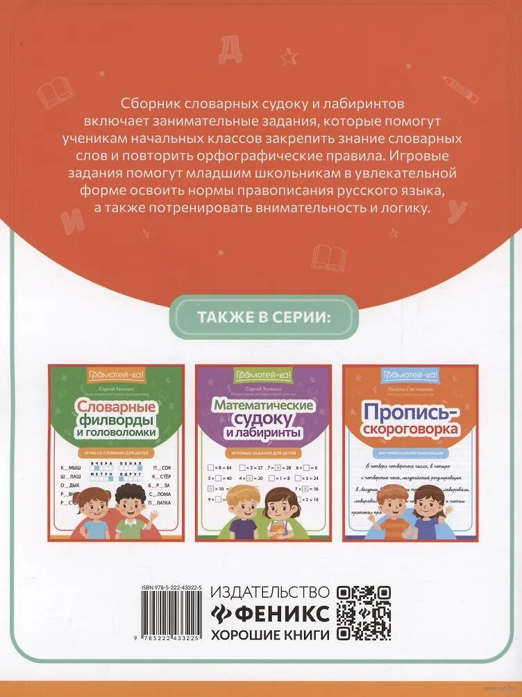 Сборник словарных судоку и лабиринтов включает занимательные задания, которые помогут ученикам начальных классов закрепить знание словарных слов и повторить орфографические правила. Игровые задания помогут младшим школьникам в увлекательной форме освоить нормы правописания русского языка, а также потренировать внимательность и логику.