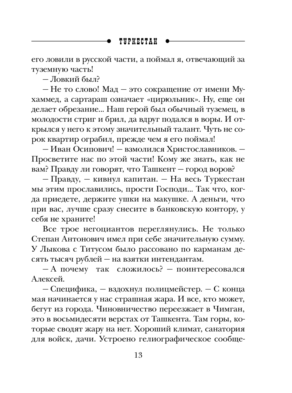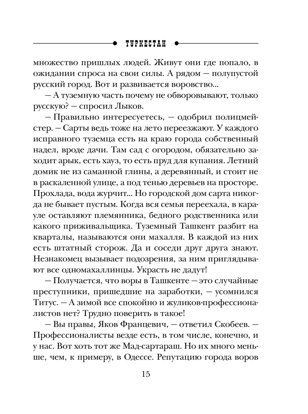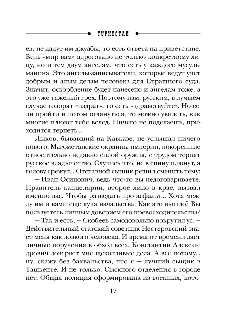 Июнь 1894 года. Оставив службу в Департаменте полиции, Алексей Лыков вместе со своим приятелем Титусом едут в Туркестан, чтобы продать лес для строительства железных дорог. Ташкент – город на Великом шелковом пути – встречает путников прекрасными мечетями, яркими коврами и людными улицами. Казалось бы, ничто не может нарушить привычной и размеренной жизни горожан. Но Ташкент потрясает череда кровавых и жестоких убийств. Самое странное, что все жертвы – русские поселенцы. Кто стоит за этим? Новоиспеченные лесопромышленники решают помочь полицеймейстеру туземной части, полковнику Скобееву, расследовать это запутанное дело, в котором, как выясняется, замешаны не только мусульманские фанатики…