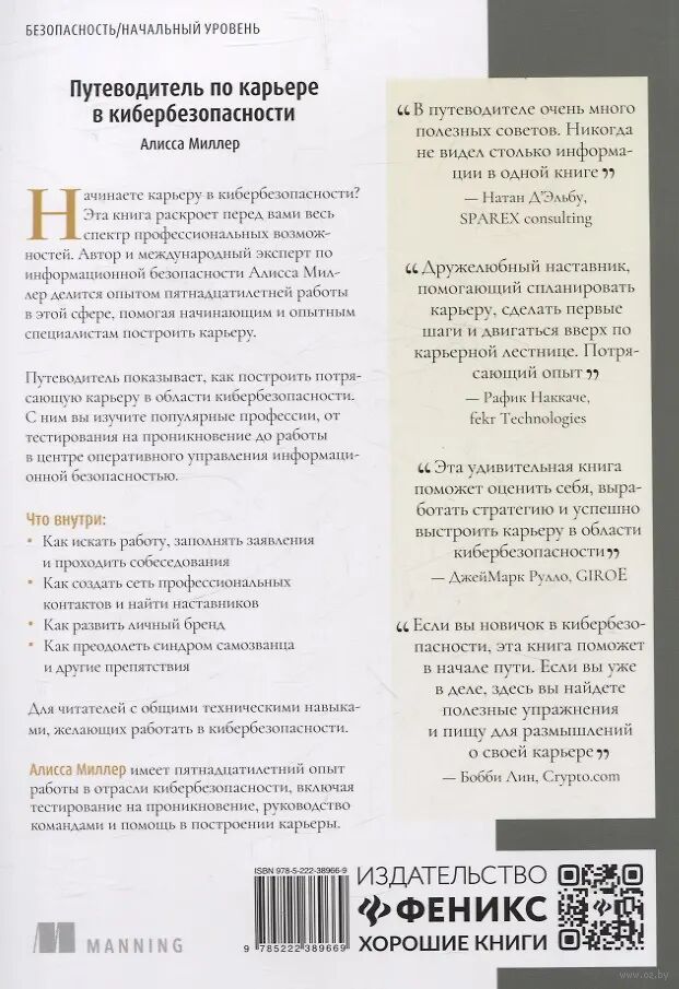 Книга предоставляет читателю широкий выбор профессий в кибербезопасности и помогает найти подходящую для себя. Автор, эксперт Алисса Миллер, делится 15-летним опытом работы в этой сфере и помогает читателям начать карьеру уверенно и успешно. Книга содержит практические советы, упражнения и методики для развития навыков.