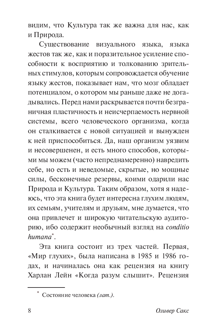 В работе "Зримые голоса" – одном из самых интересных своих произведений – Оливер Сакс выдвигает смелую и оригинальную теорию, согласно которой именно язык жестов – подлинный и первоначальный язык головного мозга.
