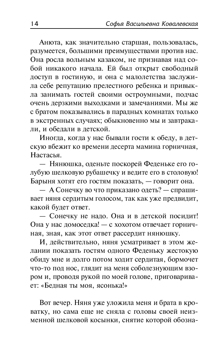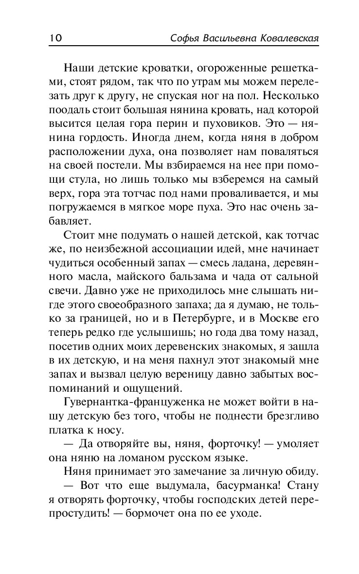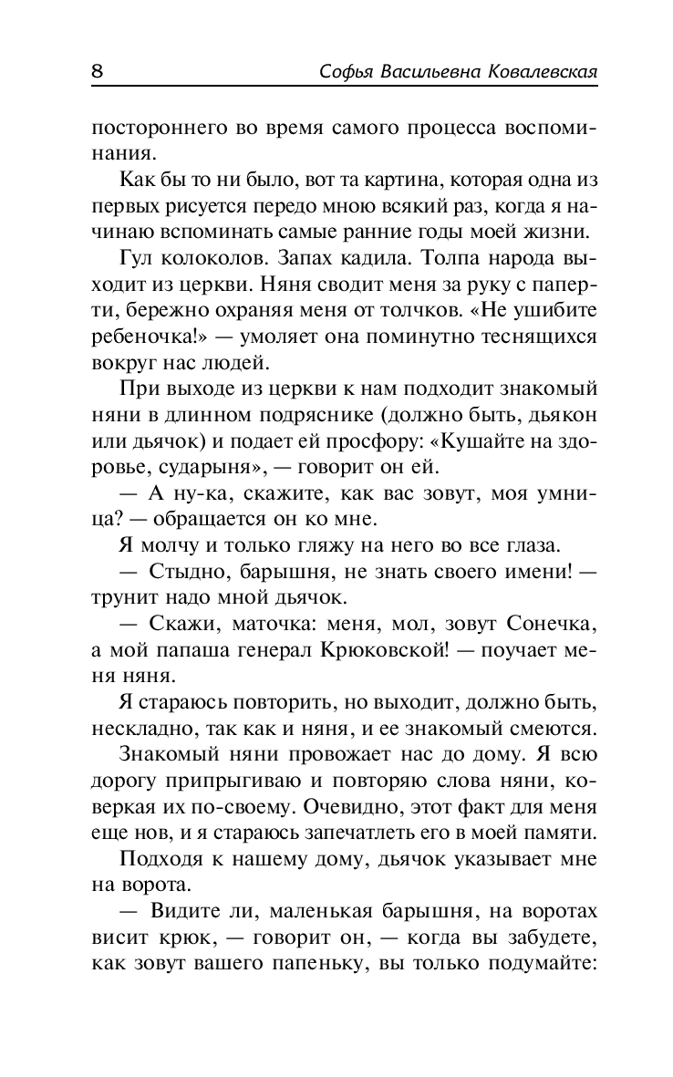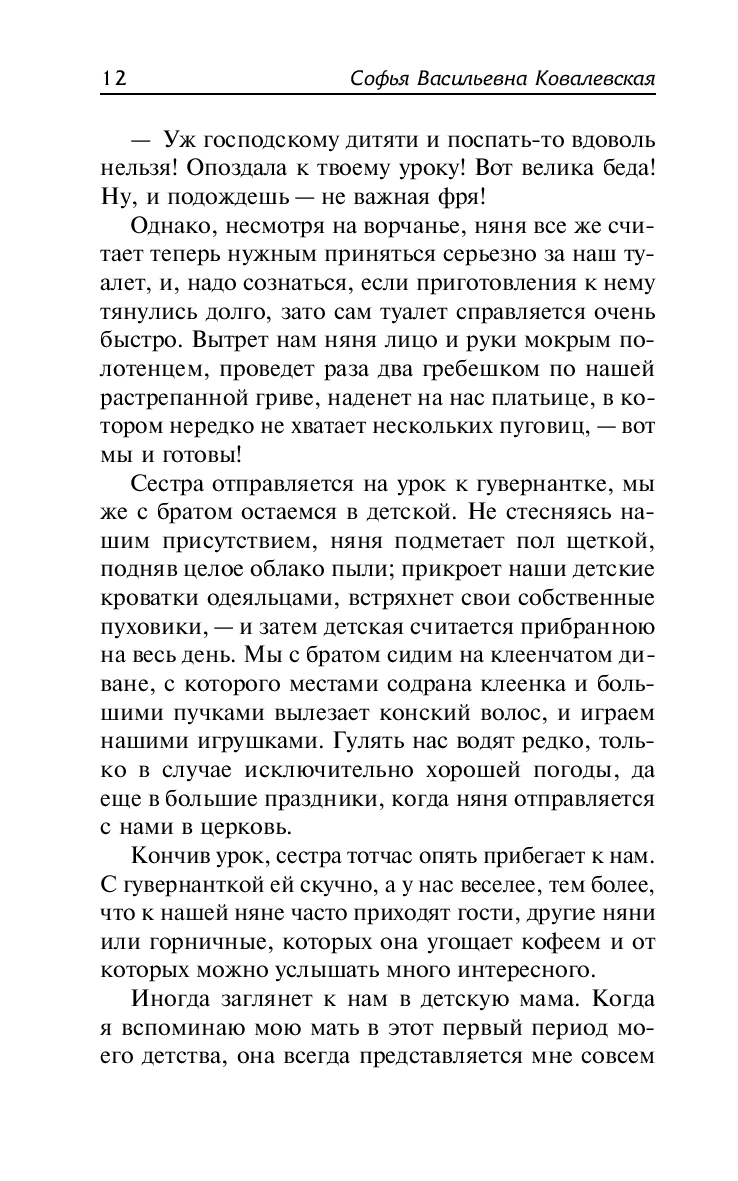 В автобиографической повести "Воспоминания детства" Софья Ковалевская рассказывает о своем детстве и первом знакомстве с математикой, о жизни в родительском доме и встречах с Ф. М. Достоевским, о быте и нравах дворянской семьи.
