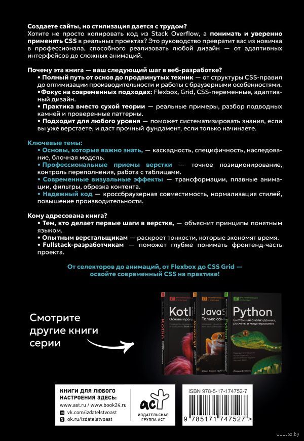 Книга охватывает весь спектр возможностей CSS: от базового синтаксиса и правил форматирования до сложных тем, таких как Flexbox, Grid, анимации, трансформации и управление слоями. В ней представлены разъяснения ключевых концепций, примеры кода и советы по оптимизации, которые помогут как начинающим, так и опытным разработчикам углубить свои знания и улучшить навыки веб-стилизации.