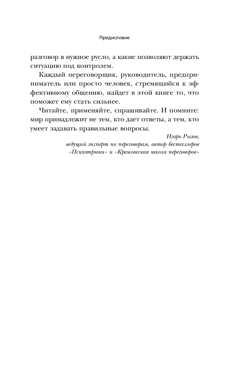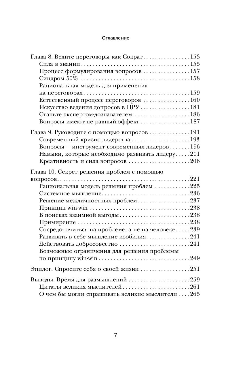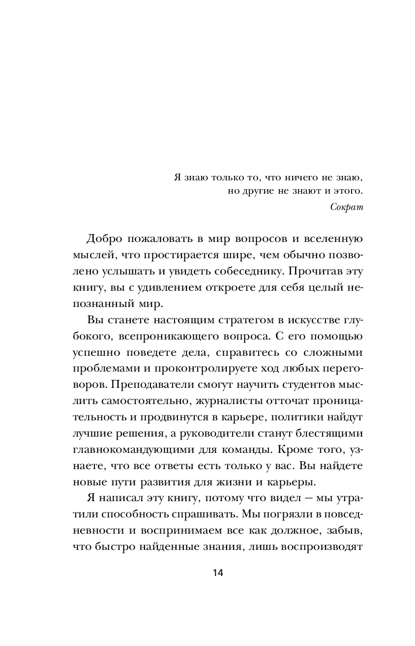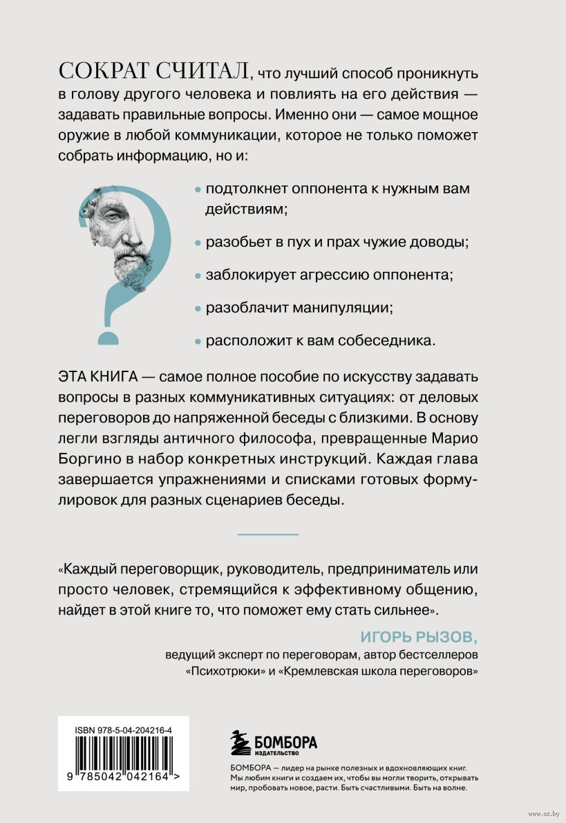 Эта книга – самое полное пособие по искусству задавать вопросы в разных коммуникативных ситуациях. От деловых переговоров до напряженной беседы с близким человеком. В основу легли взгляды античного философа, превращенные Марио Боргино в набор конкретных инструкций. Каждая глава завершается упражнениями и списками готовых формулировок для разных сценариев беседы.