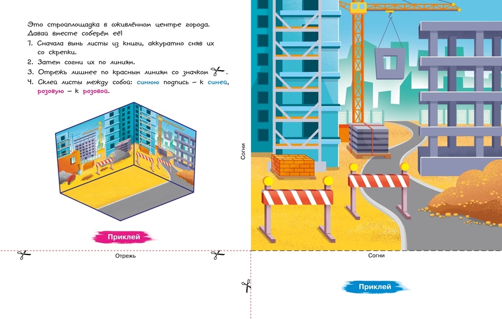 Перед вами уникальная книга для создания бумажных моделей строительных машин и стройплощадки в городе.