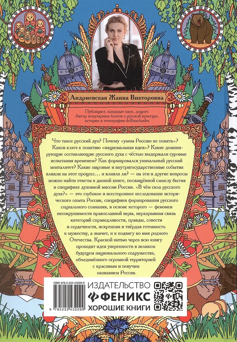 В книге "В чём сила русского духа? Философия русского сердца" представлены последовательные, системно аргументированные, интересные рассуждения автора об уникальности национального менталитета. Книга адресована тем, кто желает познакомиться с культурно-нравственными традициями России: учёным, преподавателям, аспирантам и докторантам гуманитарных дисциплин, студентам гуманитарных вузов, представителям отечественного и зарубежного экспертного сообщества, а также широкому кругу читателей, интересующихся процессом формирования национальной идентичности от глубокой древности до наших дней. Читателя, несомненно, заинтересуют оригинальные выводы, сделанные на основе глубокого исследования самобытного русского фольклора, философских трудов русских учёных, исторических документов, сюжетов русской классической литературы, социально значимых фактов.