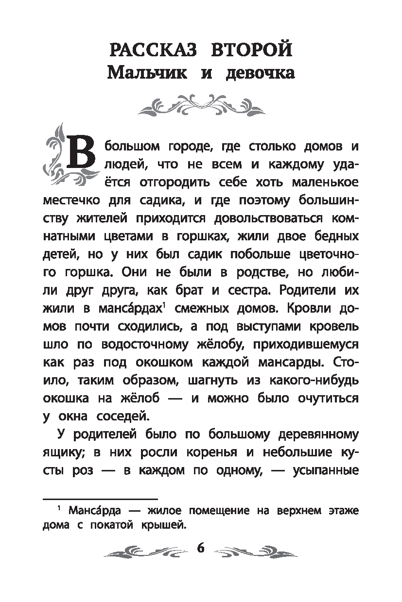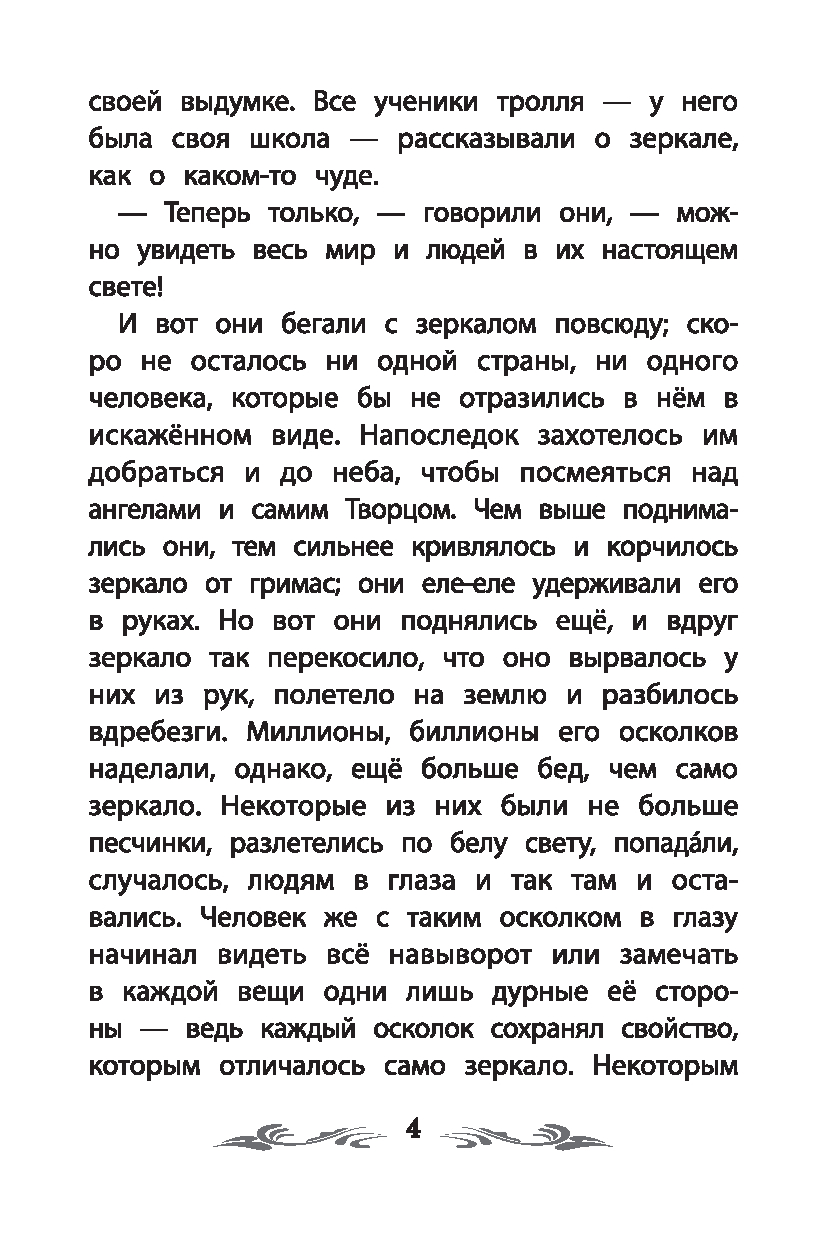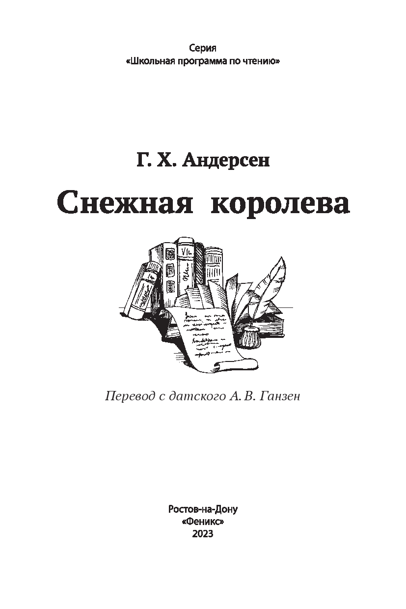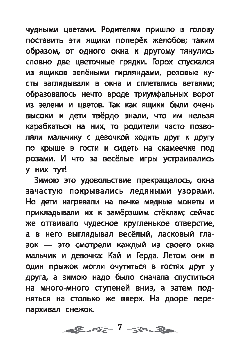 Ганс Христиан Андерсен (1805-1875) – один из самых знаменитых сказочников мира. Родился в бедной семье башмачника и прачки. Несмотря на трудную жизнь, мальчик с раннего детства был погружён в сказочный мир: отец часто читал ему вслух волшебные сказки, а склонность к фантазиям и мечтательность помогали ему справиться с жизненными невзгодами. В возрасте 14 лет Андерсен отправился в Копенгаген, чтобы, как он сказал матери, "стать знаменитым". Фантастический рассказ "Пешее путешествие от канала Холмен к восточной оконечности Амагера", опубликованный в 1829 году, был благосклонно встречен читающей публикой и принёс писателю известность. В 1833 году Андерсен получил королевский грант и отправился путешествовать. За полтора года он посетил Германию, Швейцарию, Францию и Италию. Путешествие очень вдохновило писателя, и в 1835 году он опубликовывает свой первый сборник сказок. Книга сразу же стала популярной и имела большой успех. Всего Андерсен написал более 160 сказок. "Снежная королева" – одна из самых известных сказок писателя, которую с удовольствием читают дети и взрослые во всём мире. По ней снято множество мультипликационных и художественных фильмов, поставлен одноимённый балет, написана опера "История Кая и Герды". "Снежная королева" – это история любви и потери, долгих поисков и борьбы. Отчаянные попытки девочки, которая одна-одинёшенька бредёт по свету босиком, чтобы найти и вернуть домой её названого братца, не оставляют равнодушными ни героев книги (ей помогают река и цветы, голуби и вороны, разбойница и принц с принцессой, олень и жительницы далёких северных земель, а под конец даже ангелы), ни читателей – совсем юных и взрослых. Эта история о преданности человеческого сердца и о милосердии мира каждому из нас обещает: какие бы ветры ни носились над землёй, какие бы разлуки и потери ни стояли на нашем пути – в конечном счёте всё будет хорошо и правильно, так уж устроен мир! Для младшего школьного возраста. Текст произведения приводится без сокращений.