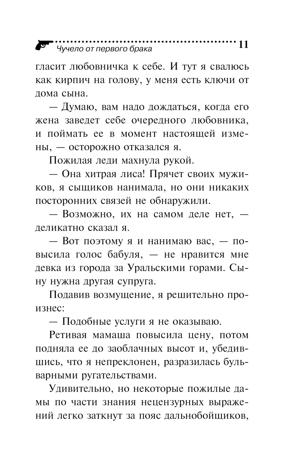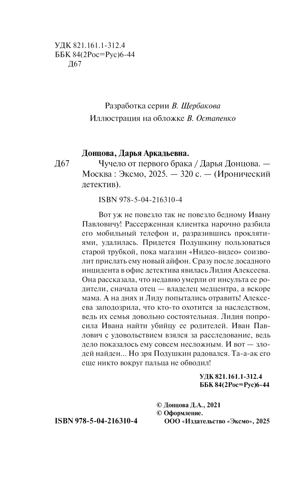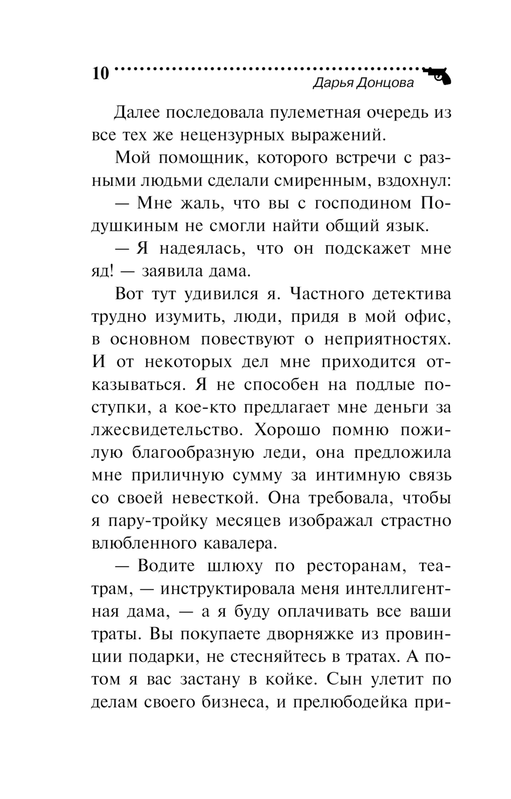 Вот уж не повезло так не повезло бедному Ивану Павловичу! Рассерженная клиентка нарочно разбила его мобильный телефон и, разразившись проклятиями, удалилась. Придется Подушкину пользоваться старой трубкой, пока магазин "Нидео-видео" соизволит прислать ему новый айфон. Сразу после досадного инцидента в офис детектива явилась Лидия Алексеева. Она рассказала, что недавно умерли от инсульта ее родители, сначала отец – владелец медцентра, а вскоре мама. А на днях и Лиду попытались отравить! Алексеева заподозрила, что кто-то охотится за наследством, ведь их семья довольно состоятельная. Лидия попросила Ивана найти убийцу ее родителей. Иван Павлович с удовольствием взялся за расследование, ведь дело показалось ему совсем несложным. И вот – злодей найден... Но зря Подушкин радовался. Та-а-ак его еще никто вокруг пальца не обводил!