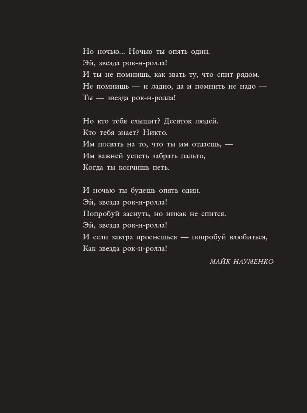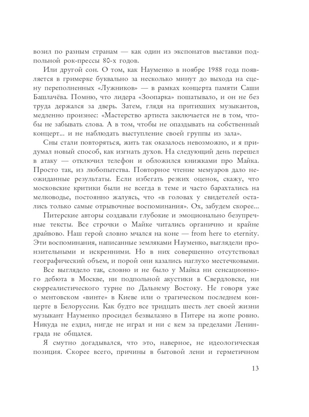Михаил "Майк" Науменко (1955–1991) – поэт, переводчик, музыкант и одна из наиболее безусловных икон «русского рока». То ли человек, то ли былинный герой. Именно поэтому его литературная биография вынуждена сочетать в себе черты исторического романа и "Одиссеи". Такова книга Александра Кушнира "Майк Науменко. Бегство из зоопарка", в которой воспоминания очевидцев событий переплетаются с неоспоримыми документами, а личные впечатления соседствуют с аналитическими выкладками. Издание завершает триптих книг автора, посвященный «жизни запрещенных людей», героями предыдущих двух томов которого были Сергей "Капитан" Курёхин и Илья Кормильцев.