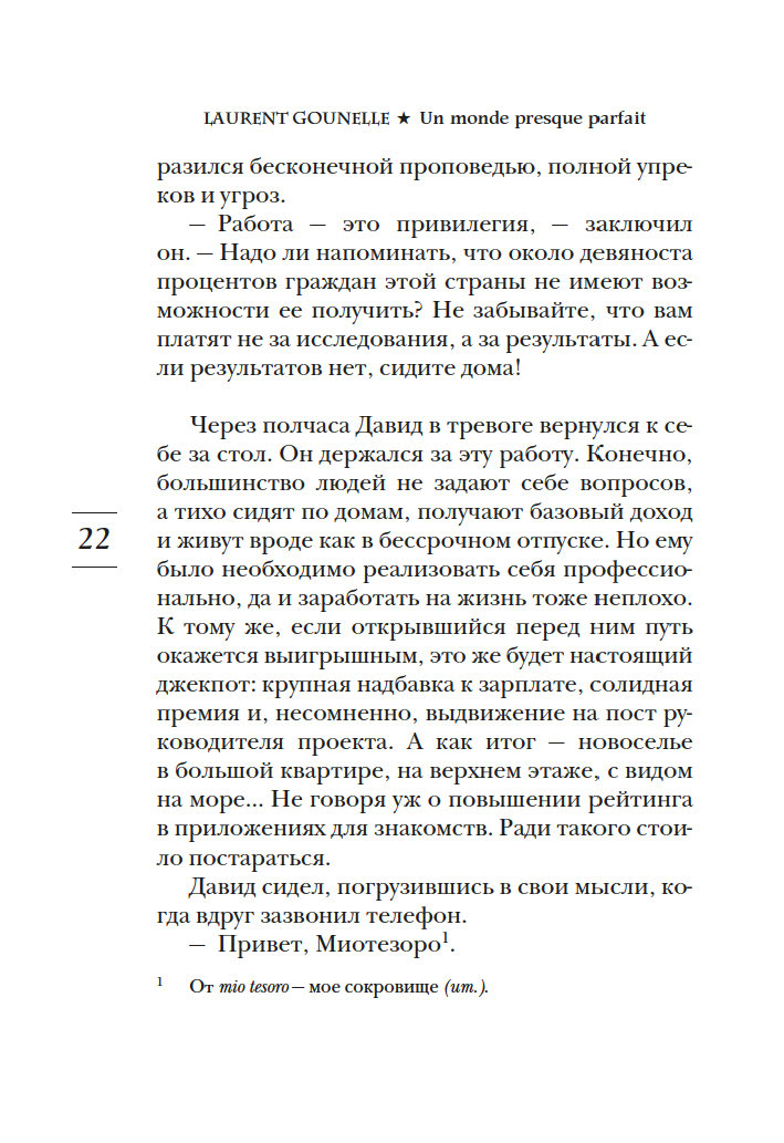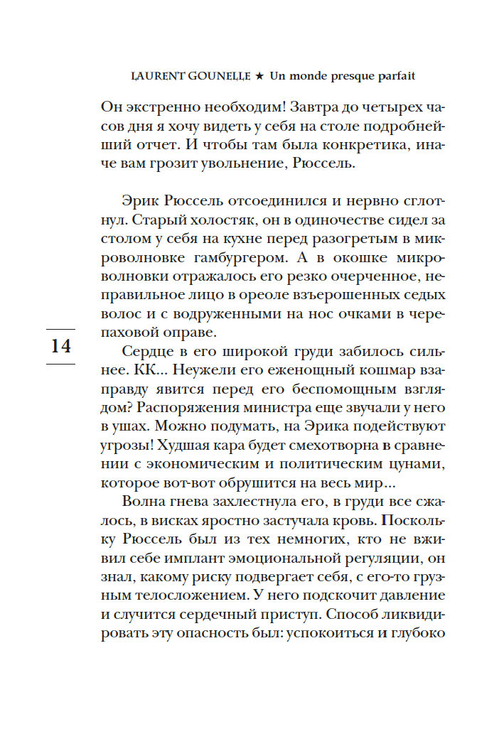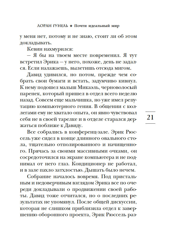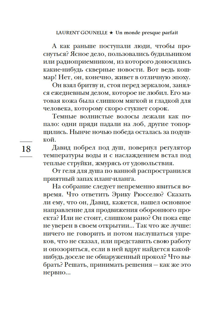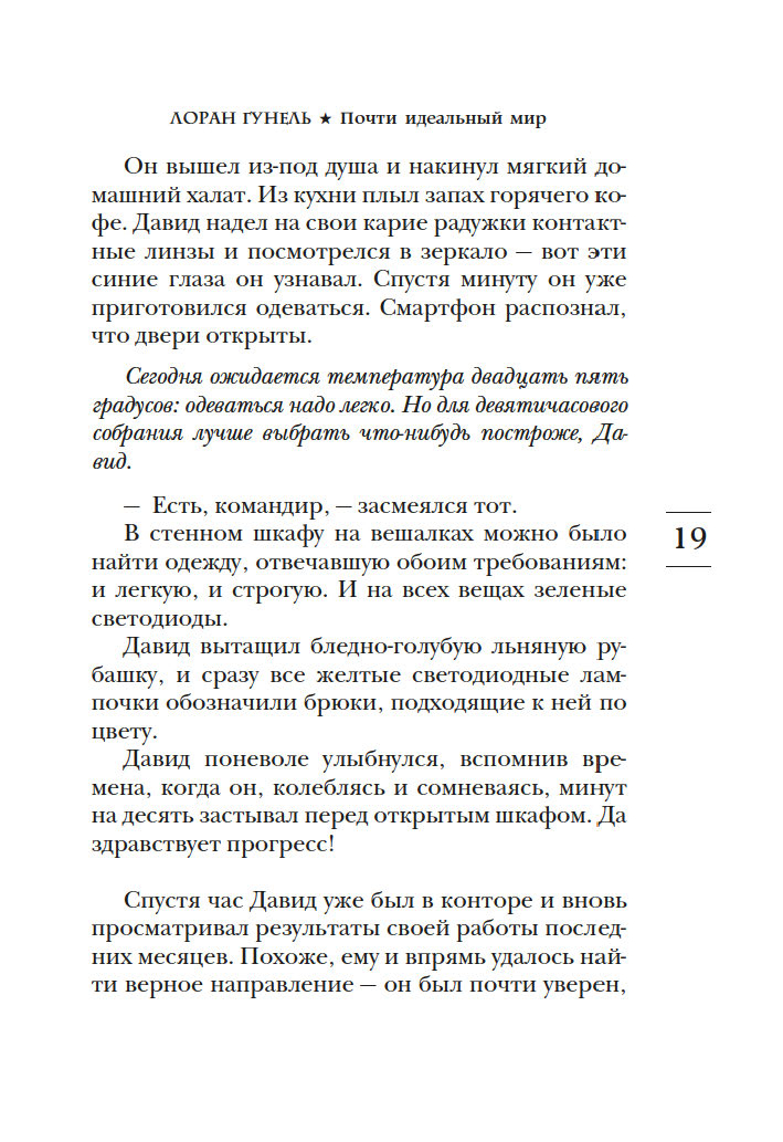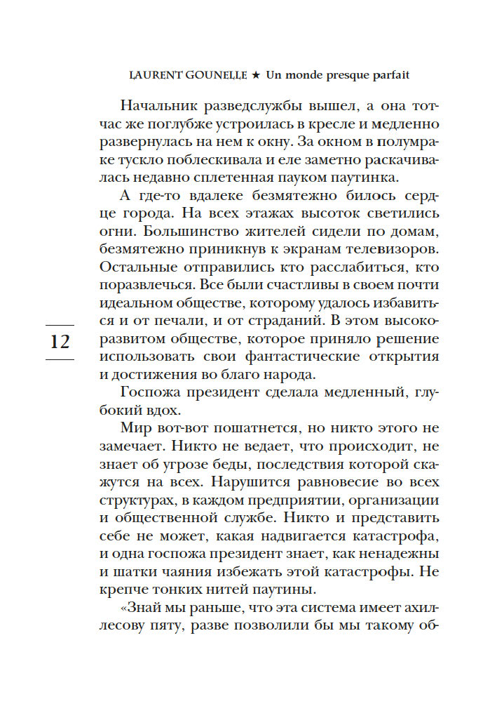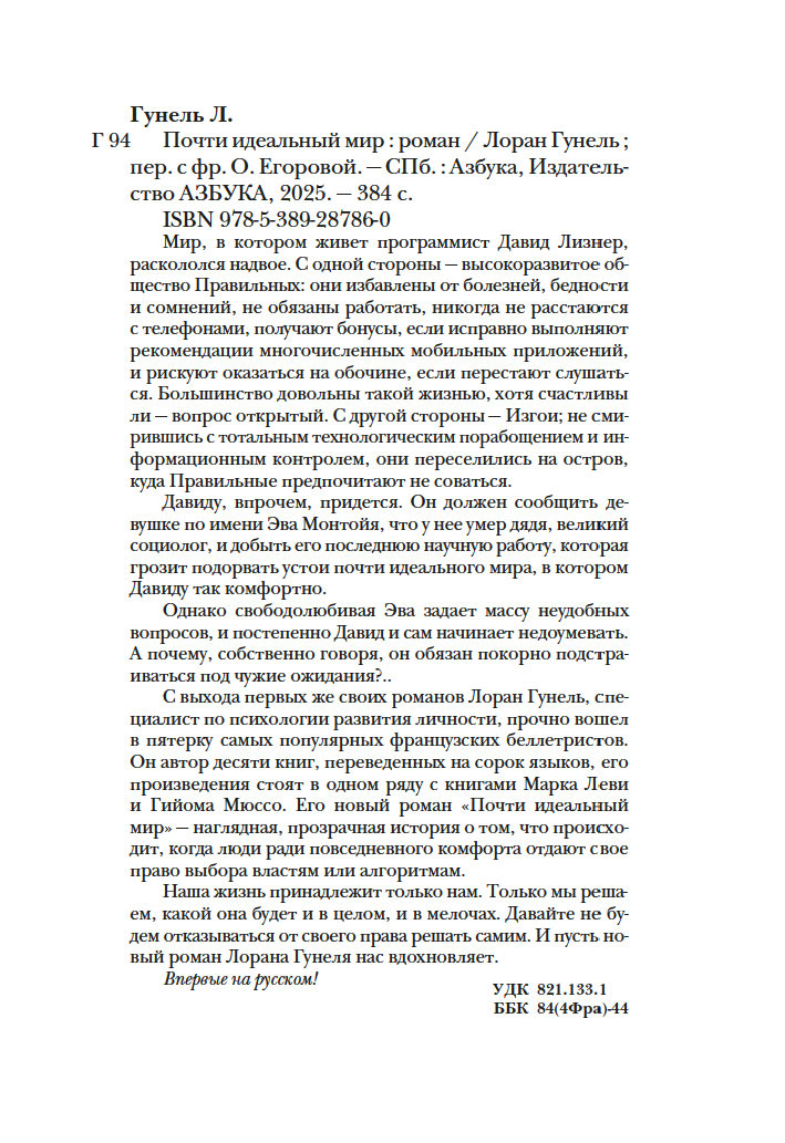 С выхода первых же своих романов Лоран Гунель, специалист по психологии развития личности, прочно вошел в пятерку самых популярных французских беллетристов. Он автор десяти книг, переведенных на сорок языков, его произведения стоят в одном ряду с книгами Марка Леви и Гийома Мюссо. Его новый роман "Почти идеальный мир" – наглядная, прозрачная история о том, что происходит, когда люди ради повседневного комфорта отдают свое право выбора властям или алгоритмам.