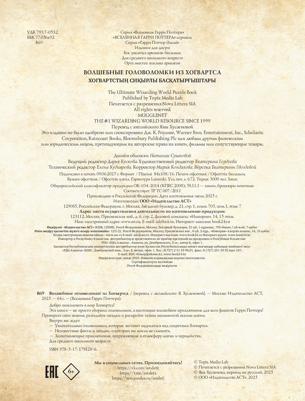 | Изготовитель | Творческое кооперативное объединение «АСТ». 129085, РФ, г. Москва, б-р Звездный, 21, стр. 1 |