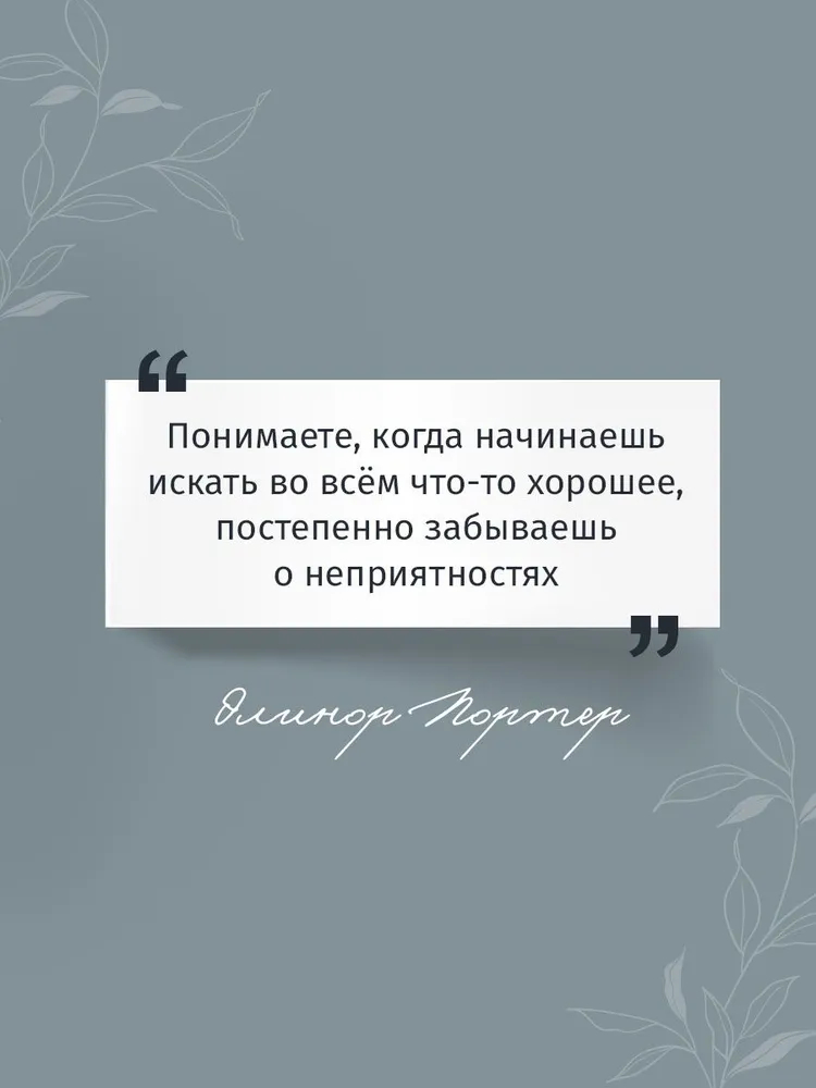 Эта книга, трогательная и добрая, учит нас не расстраиваться и во всем, даже в самых сложных ситуациях, искать что-то хорошее, ведь когда начинаешь искать во всем что-то хорошее, постепенно забываешь о неприятностях.