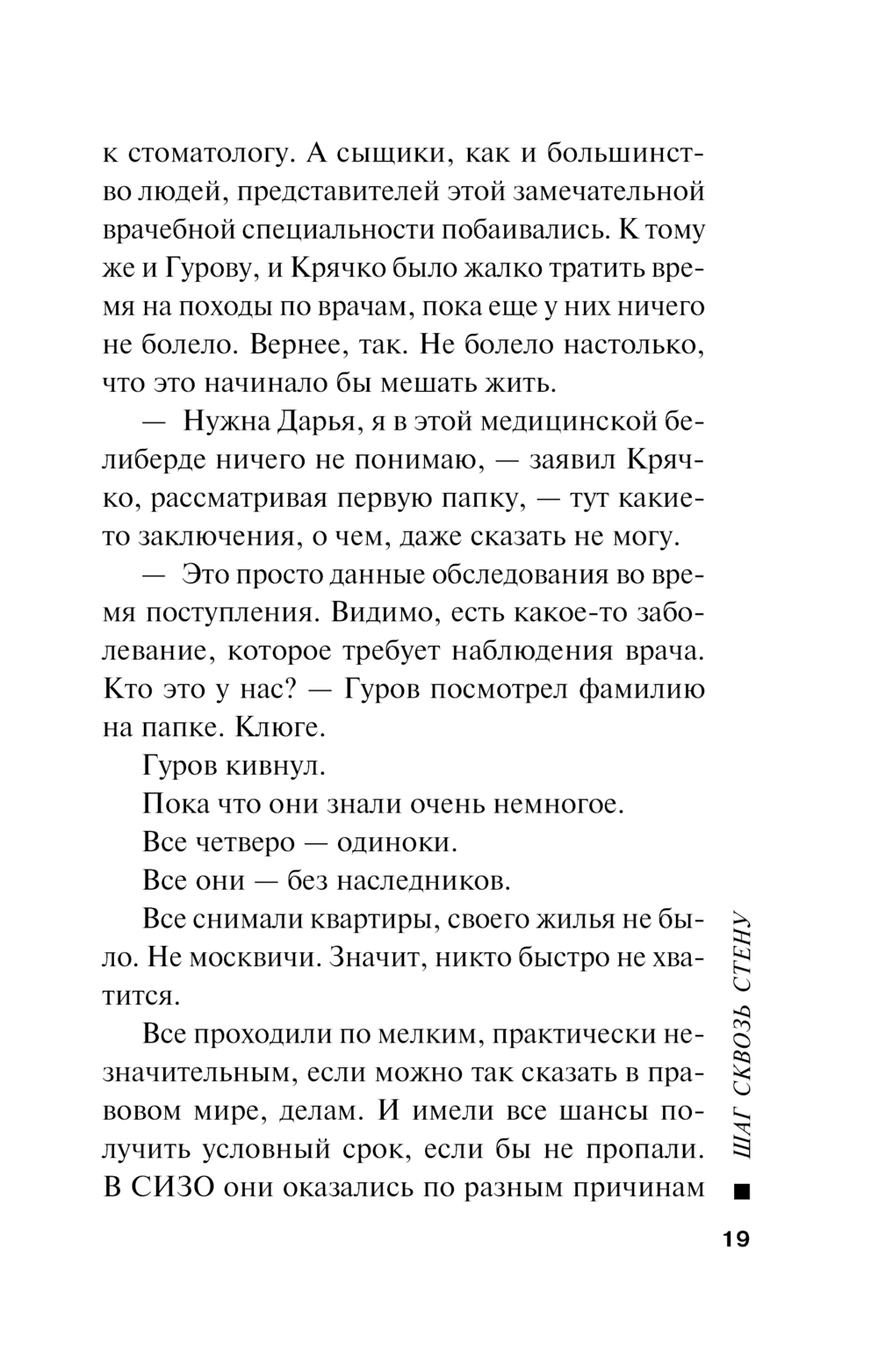 Сразу из нескольких следственных изоляторов Москвы за короткий срок незаметно пропадают четверо заключенных. Обстоятельства исчезновения у всех разные: кто-то пропал на перекличке после прогулки, кто-то из лазарета, кто-то после банного дня. Формально это побег, но – без следов взлома, без свидетелей и соучастников. Розыск беглецов поручен полковникам МВД Гурову и Крячко. Они выясняют, что все четверо зэков были одиноки, наследников не имели, снимали жилье, то есть на воле их никто особо не ждал. К тому же, по суду все они получили незначительные сроки. В чем же причина такого внезапного исчезновения?.. Решающий поворот эта история получает после того, как при странных обстоятельствах погибает одна из сотрудниц Службы исполнения наказаний, причастных к данному делу…